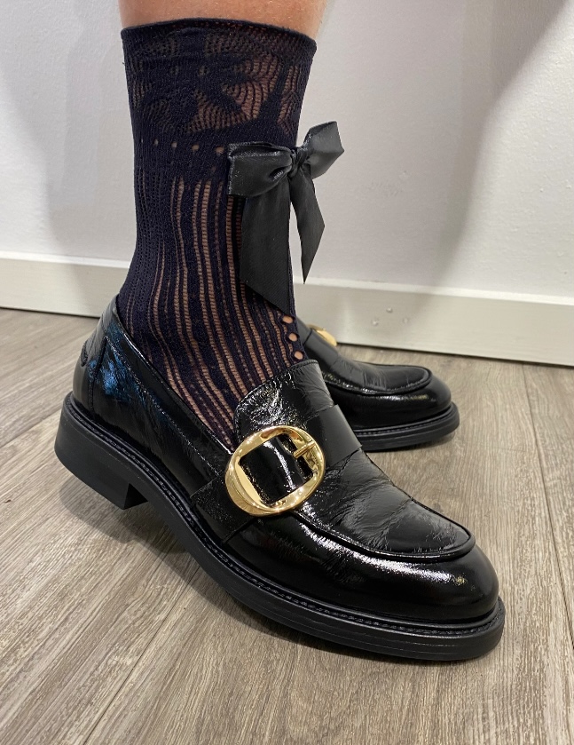 Fin strømpe med dekorativt hulmønster og sløjfe.