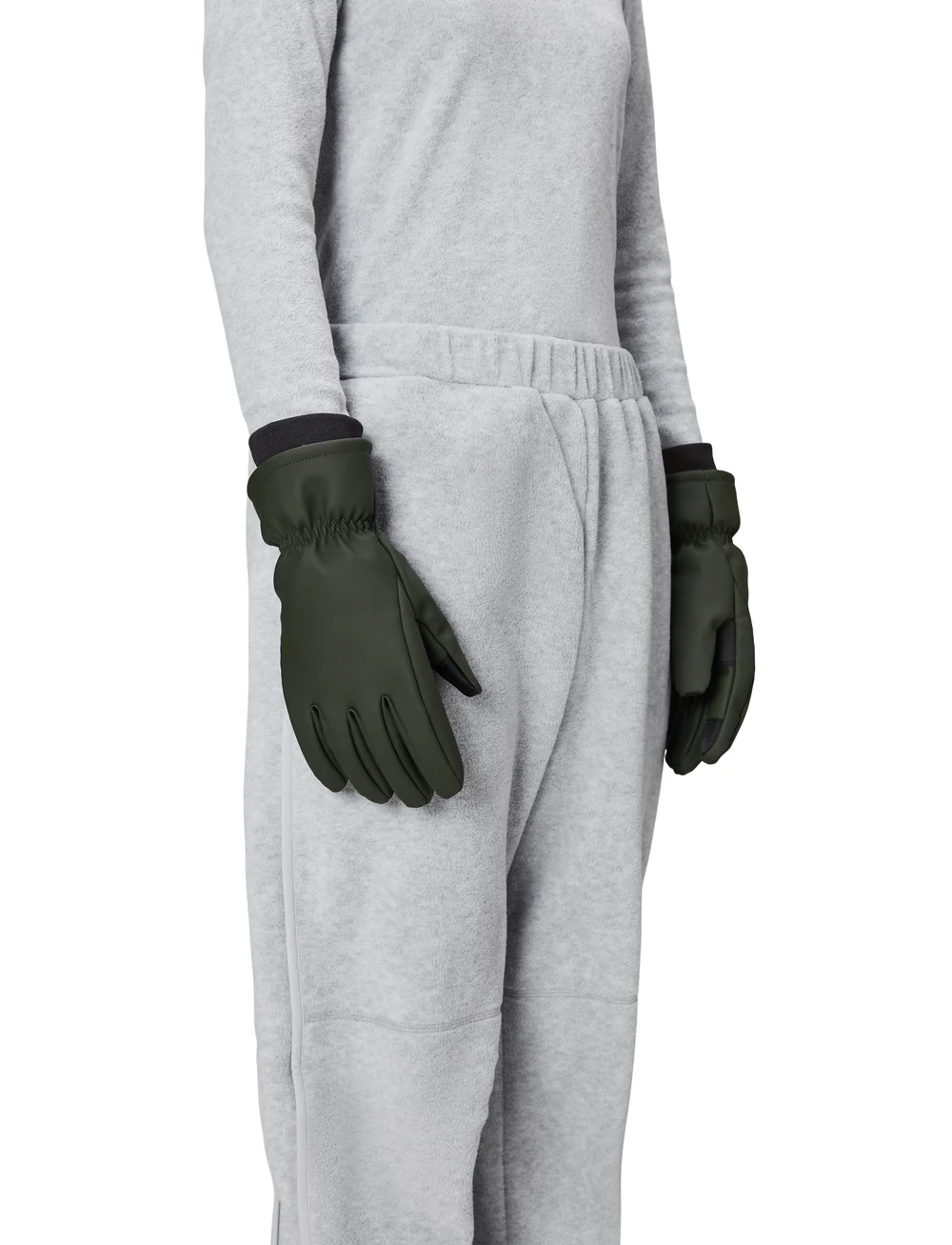 Designet er udstyret med ribbede stormmanchetter om håndleddene samt spidser på tommel- og pegefinger, der kan bruges på en touchskærm.