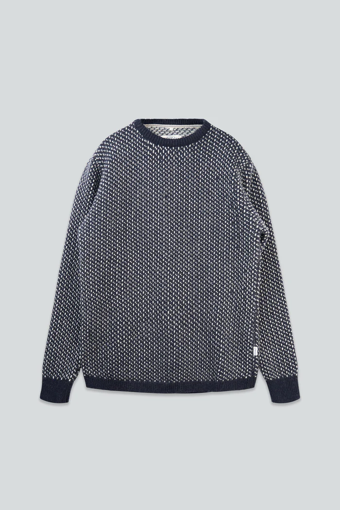 Strikken er lavet af 35% genanvendt lammeuld, 45% lammeuld og 20% genanvendt polyamid. Pasformen er regular i fittet.