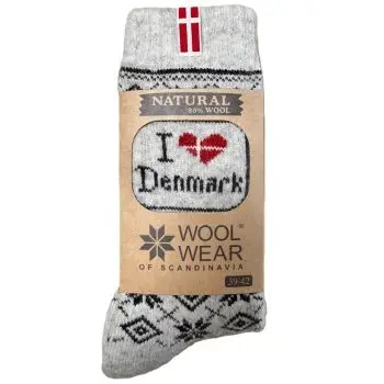 Uldne Ragsokker i topklasse af 80% blødt kamgarn, med I love Denmark logo.
