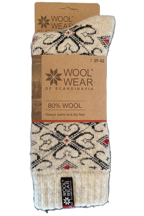 Ragsokker i smuk udgave med hjertemotiv af 80% ren ny uld fra WOOLWEAR of Scandinavia.