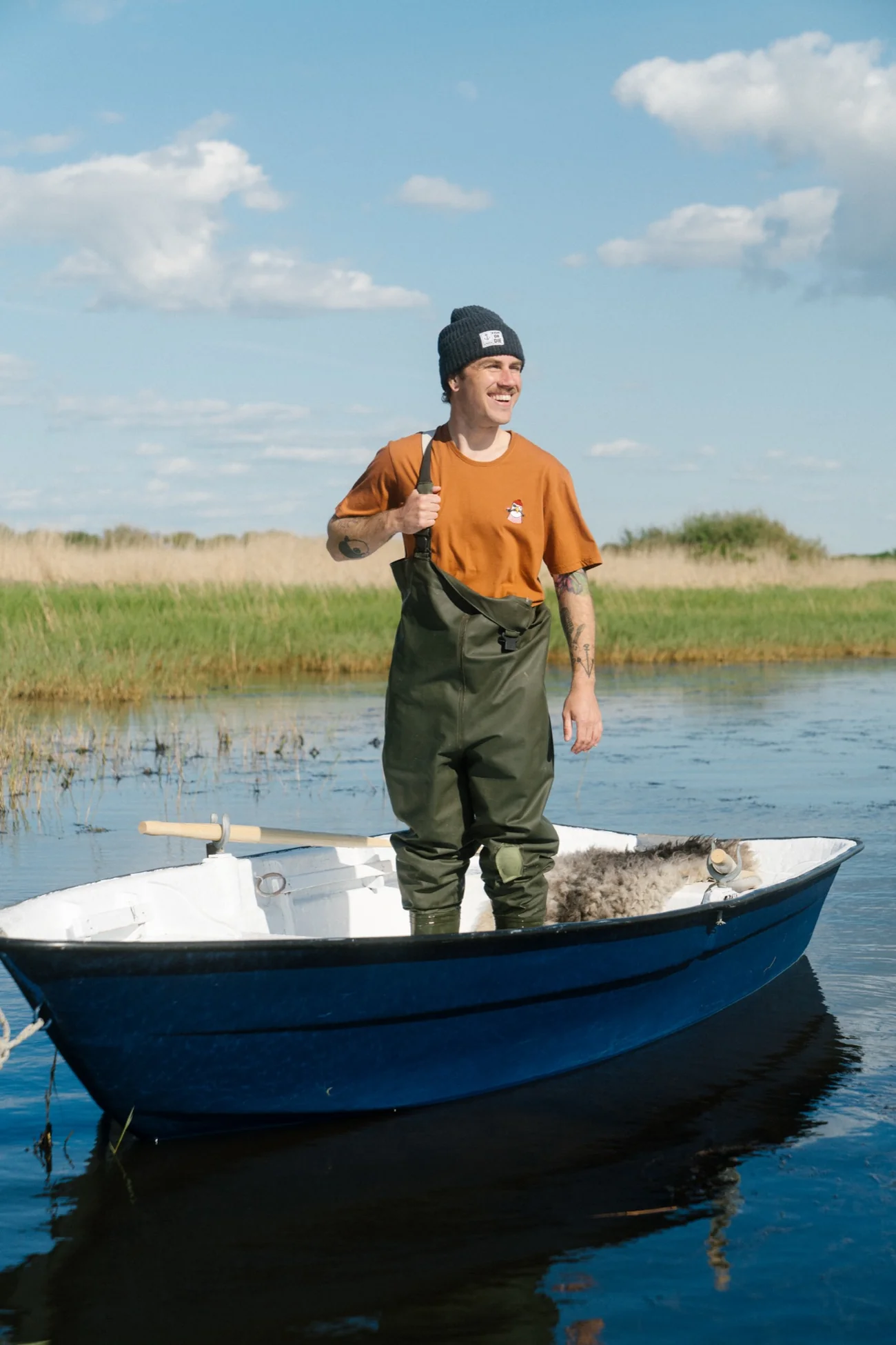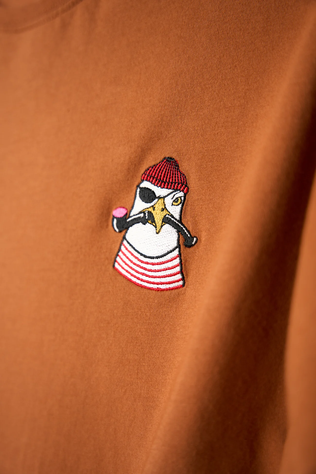 T-shirt fra LAKOR i 100% bomuld, med håndtegnet motiv af en måge med sørøverklap og lakridspibe.