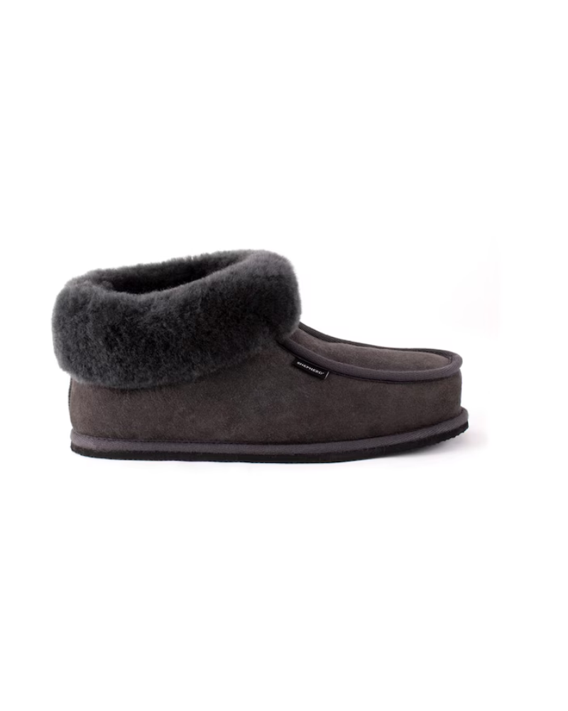 Shepherd Krister er bløde og varme ankelhøje hjemmesko i fåreskind til mænd. Hjemmeskoene har en bred fåreskindskant, med dekorativ stofbinding foran og rundt om sålen. Ydersålen er lavet af EVA.