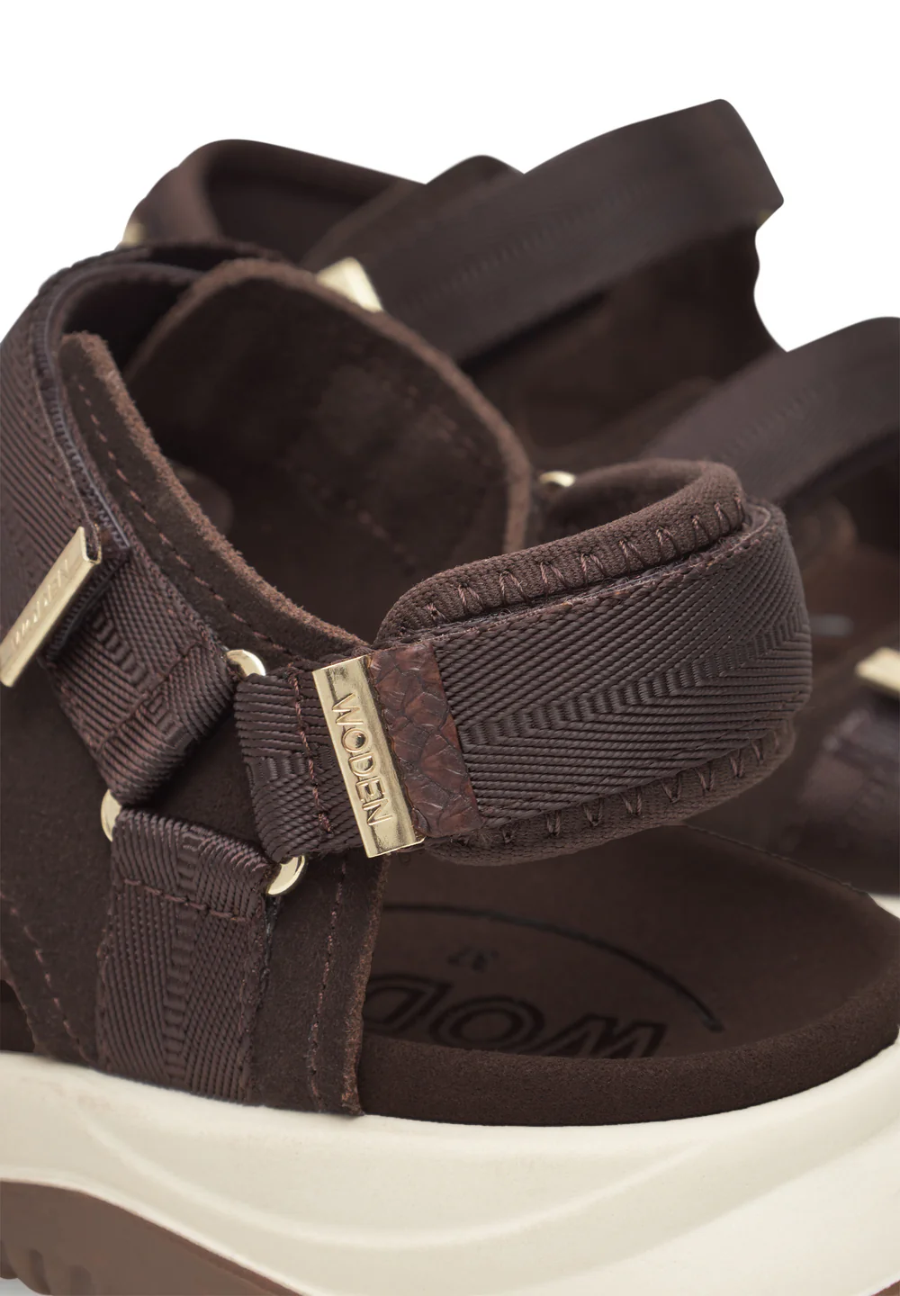 Sandalen er lavet i premium LWG-certificeret ruskind og har en anatomisk formet fodseng, der støtter foden naturligt. WODEN Natural Soft Technology sikrer komfort hele dagen.
