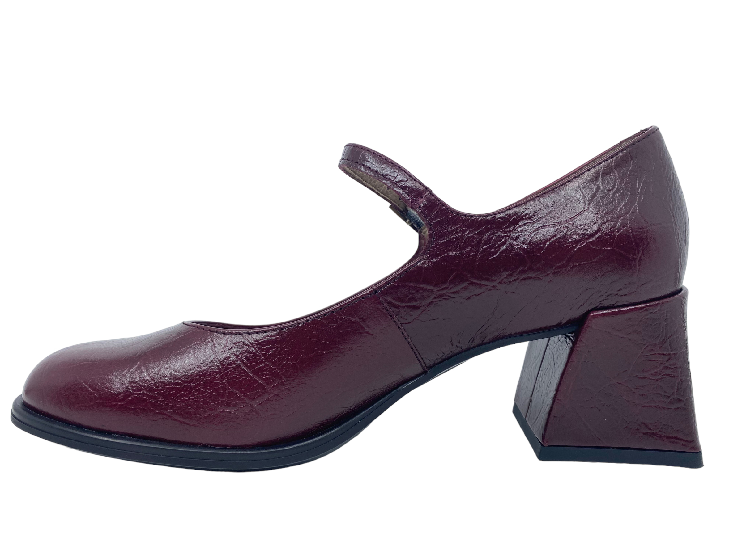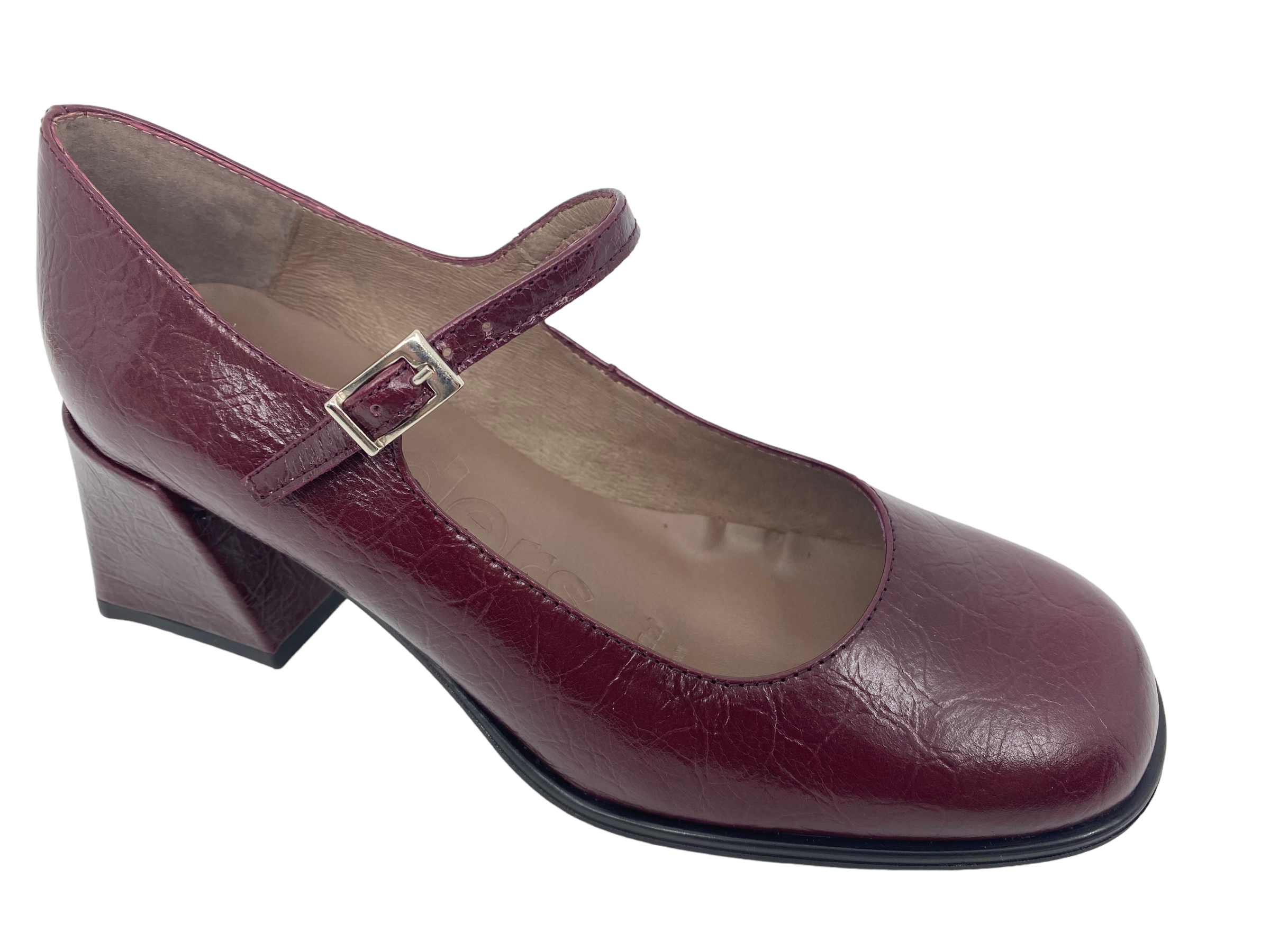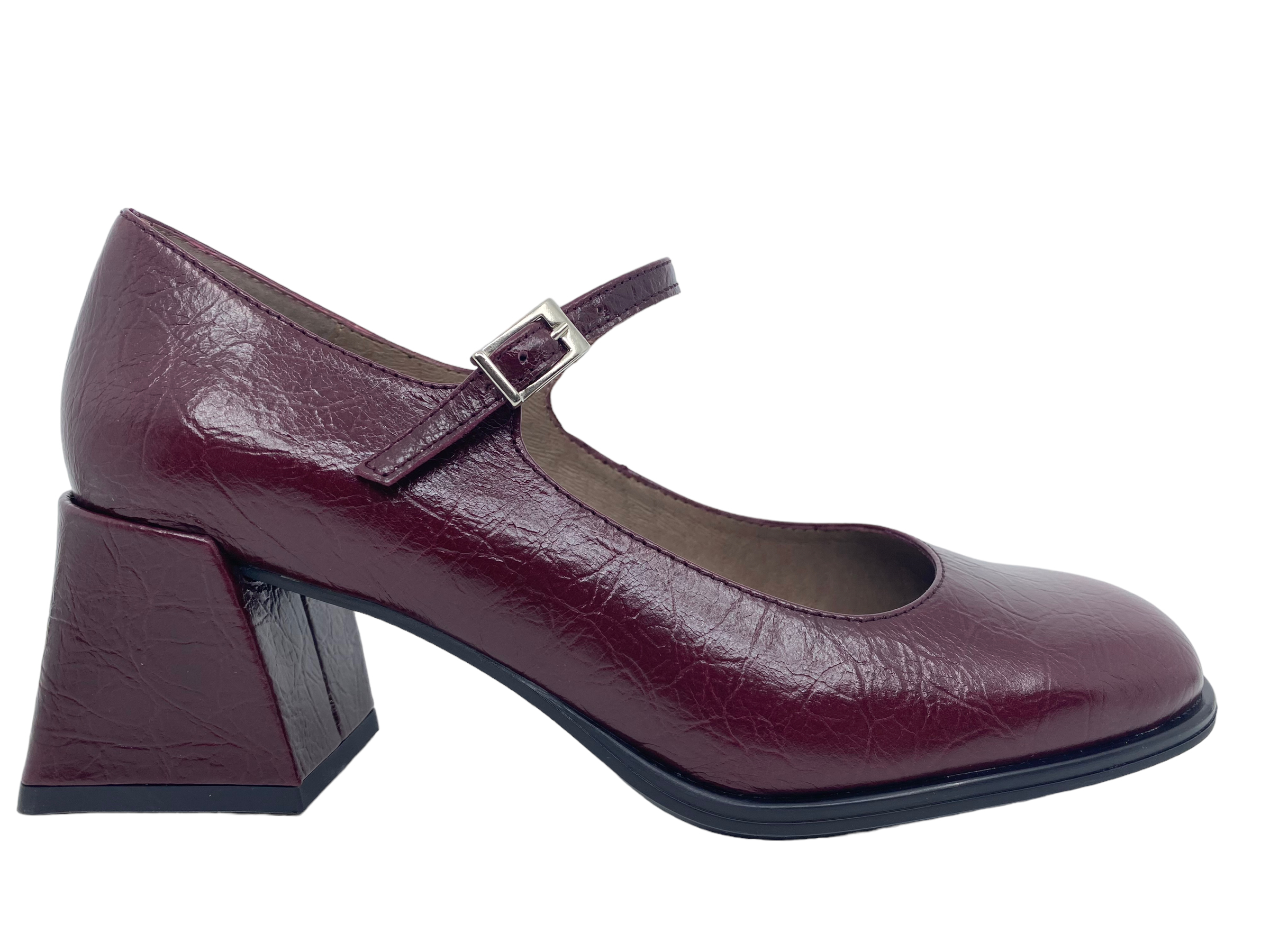 Pump fra Wonders i bordeaux - med en fin smal rem henover foden. De er lavet i en blød skindkvalitet. De har 6,5 cm hæl. De er pæne til både bukser og kjole.