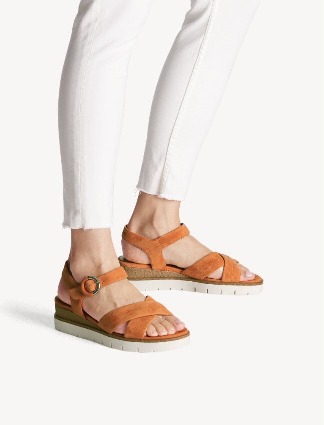 Smarte orange sandaler fra Tamaris - m. 5 cm kilehæl. Lette at komme i/af m. velcrolukning. Perfekte til dine yndlingsjeans eller kjole.