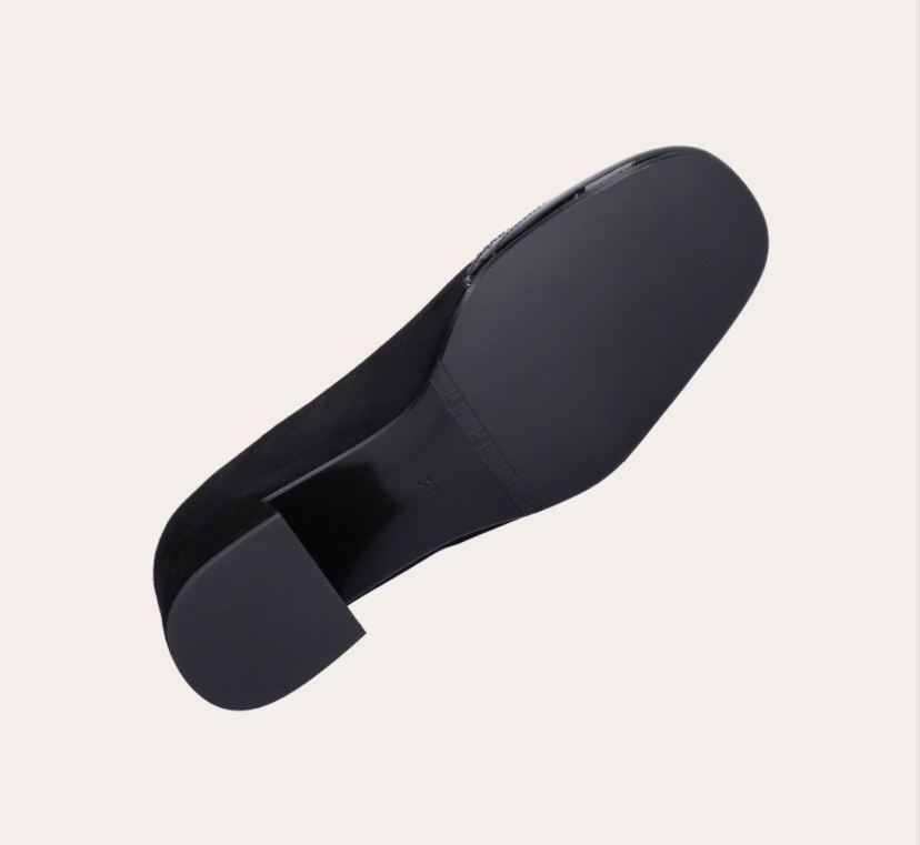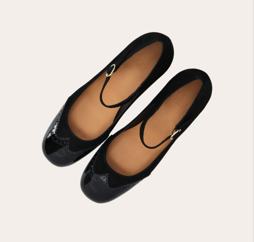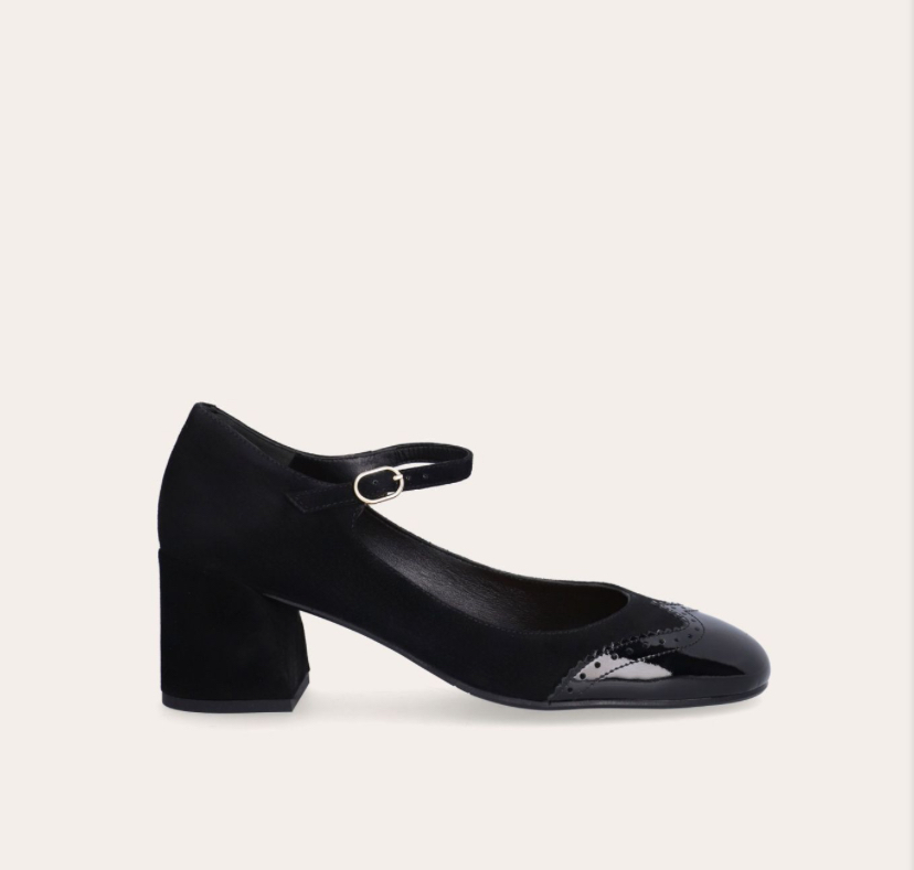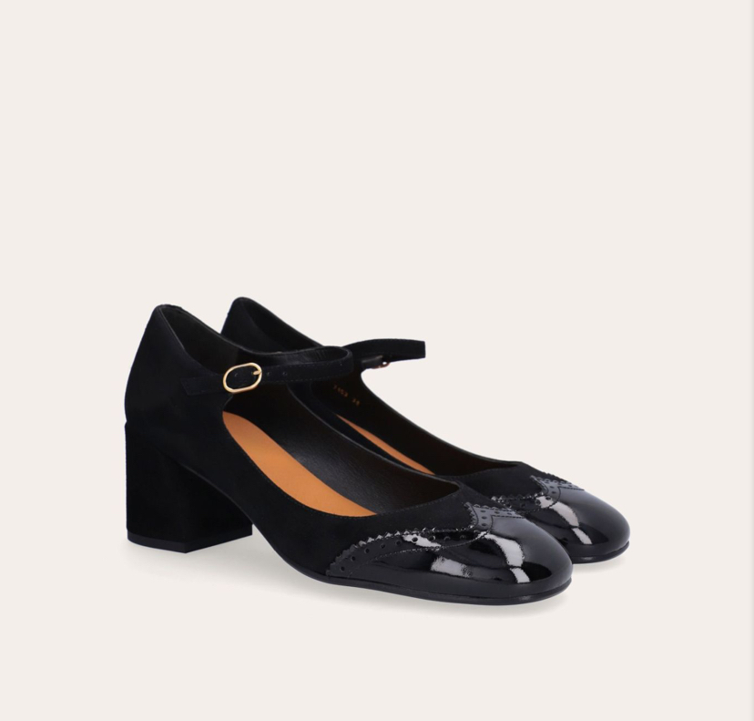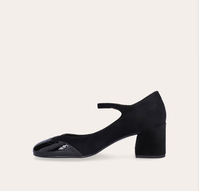 Håndlavet Mary Jane pump, udført i sort ruskind med rund tå, der tilfører et moderne og stilfuldt twist.