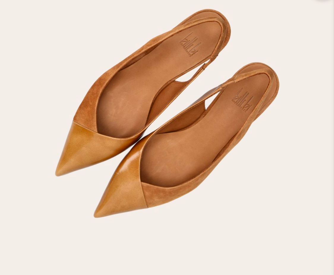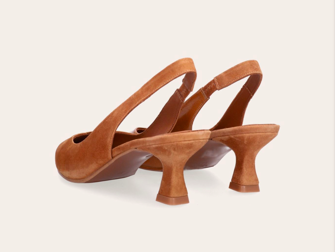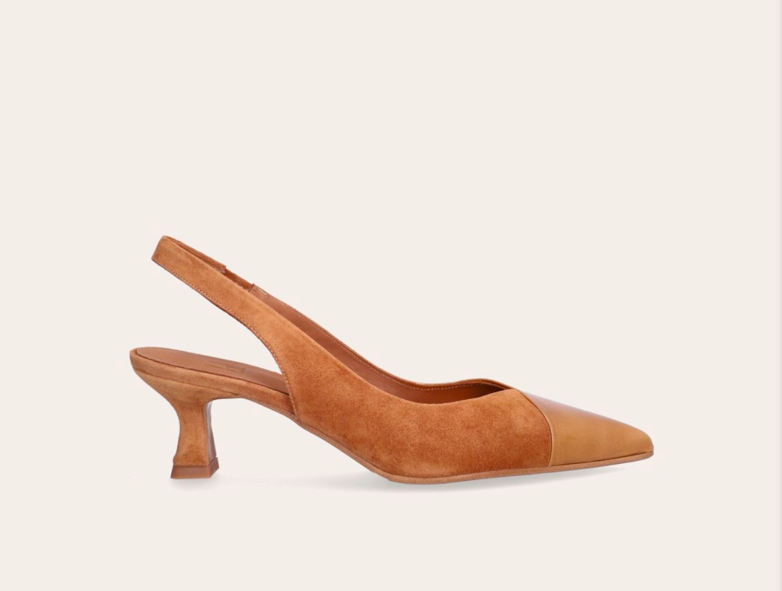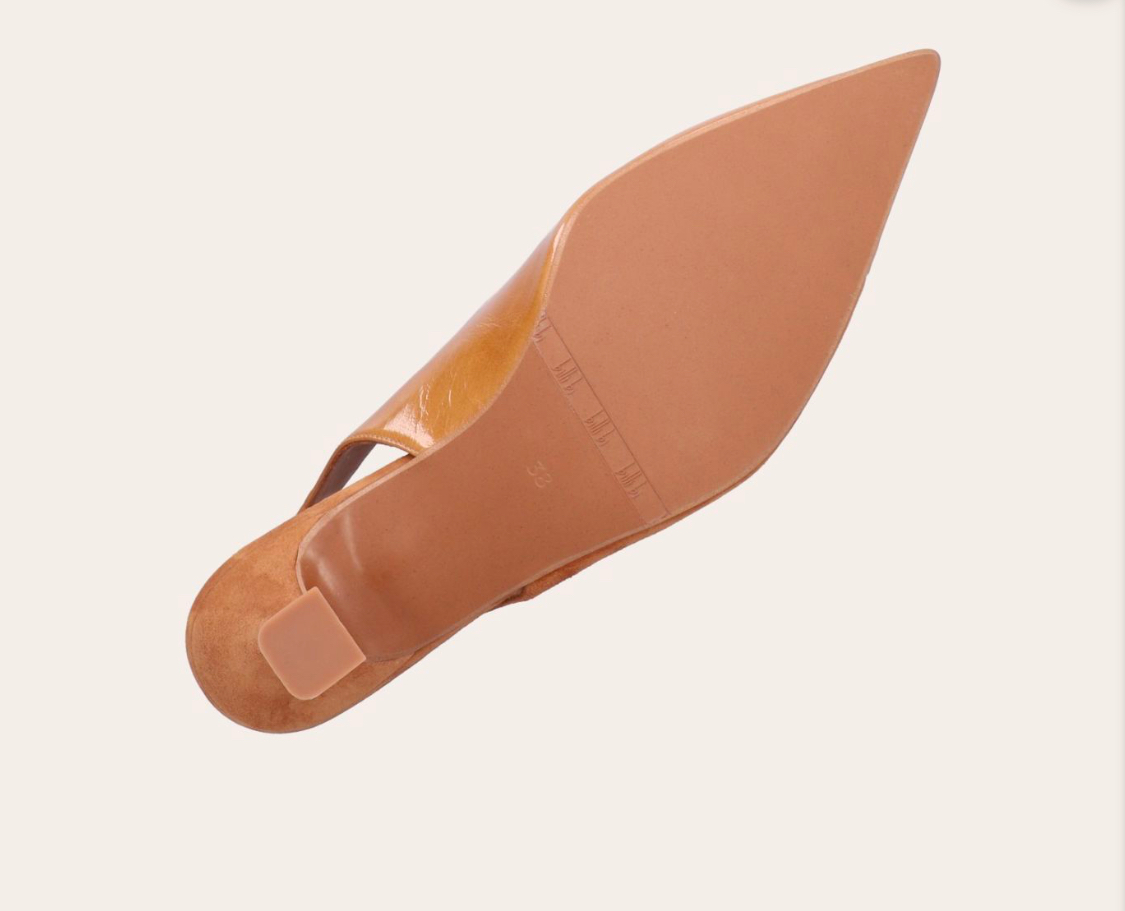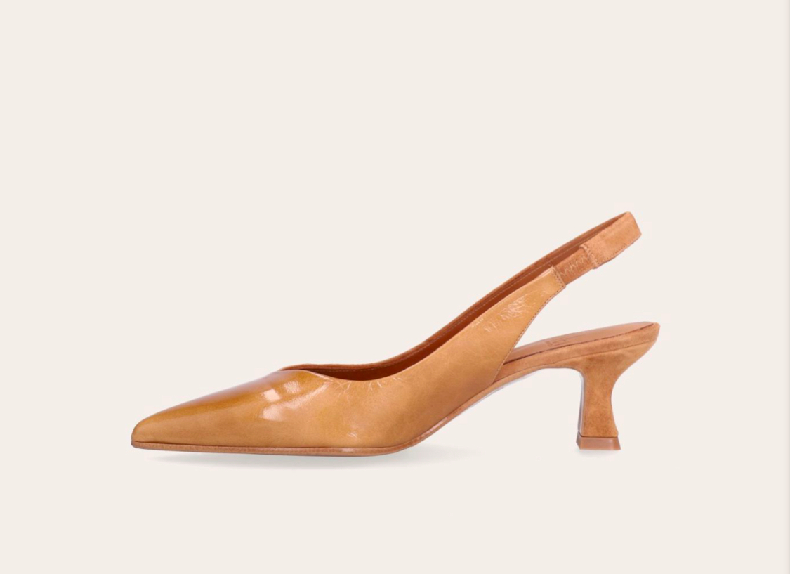 Håndlavet slingback pumpe, lavet i cognacfarvet ruskind og cognacfarvet laklæder med en spids tå.