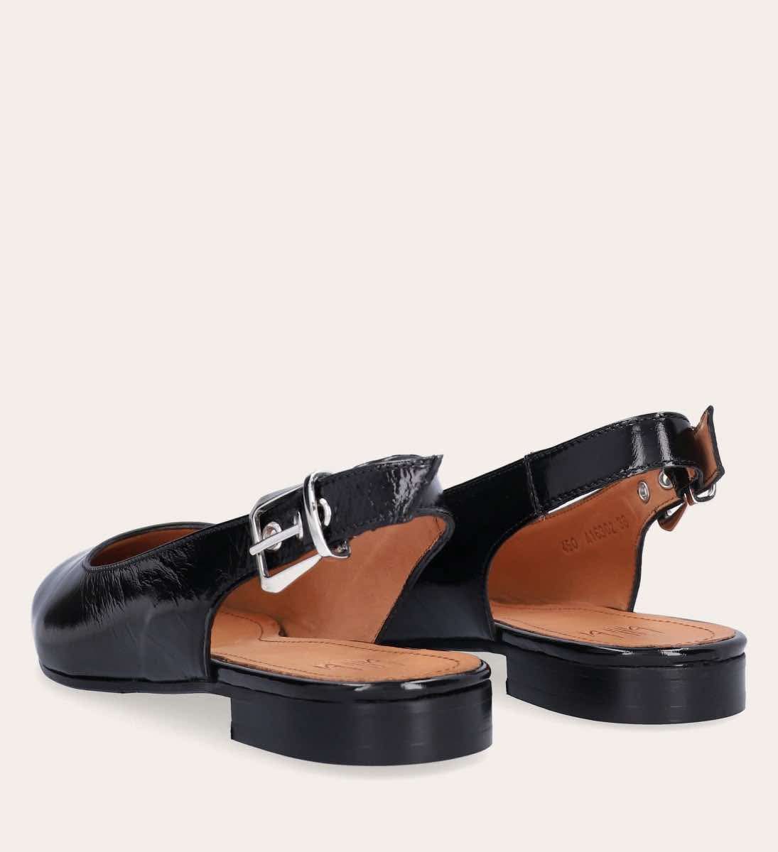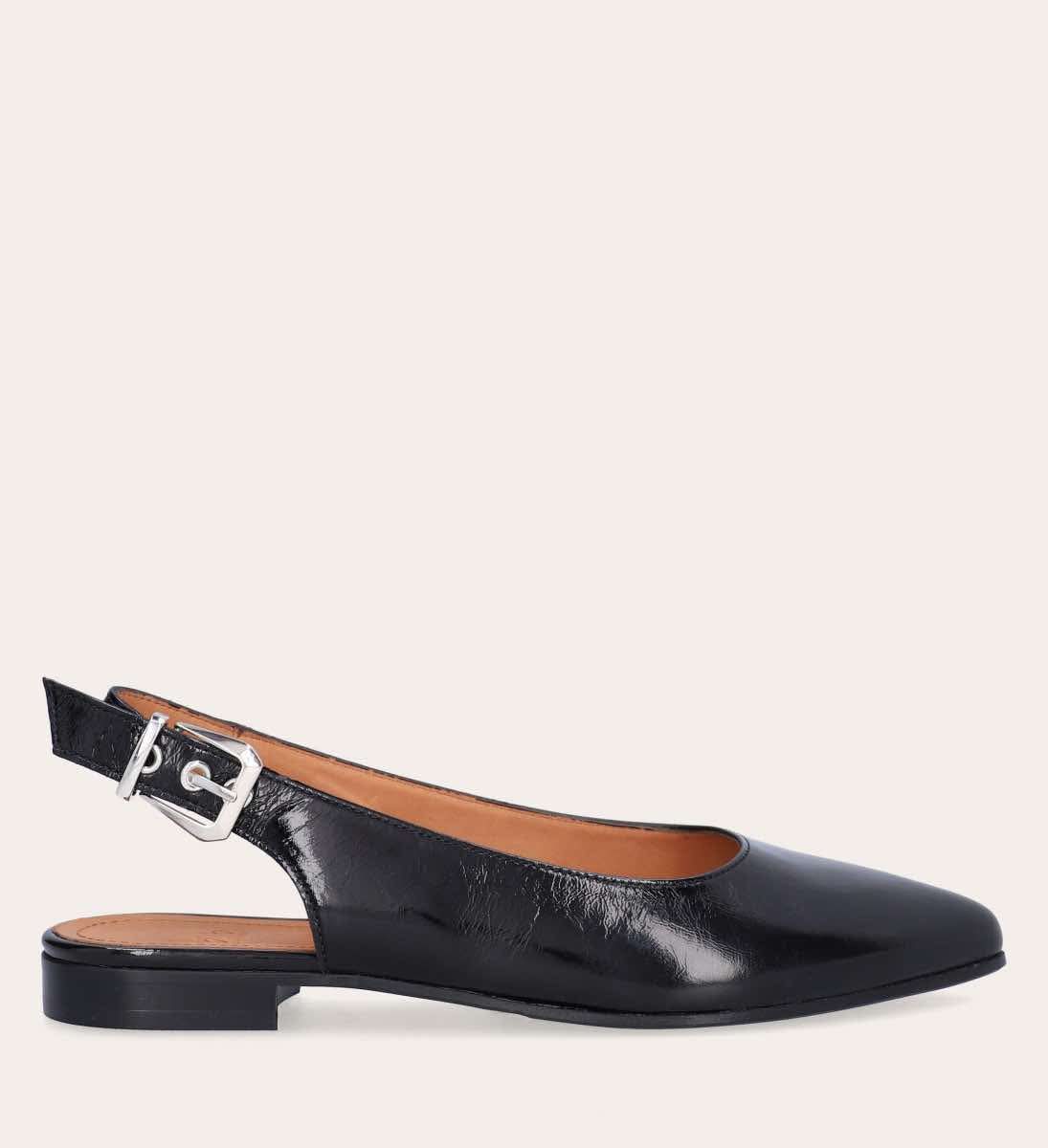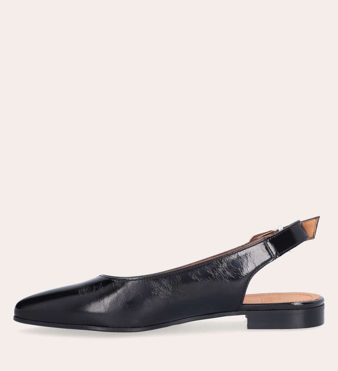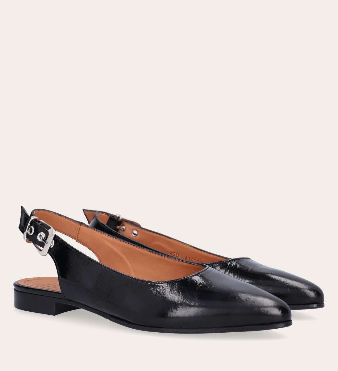 Håndlavet slingback ballerina, lavet i sort laklæder med en spids tå.