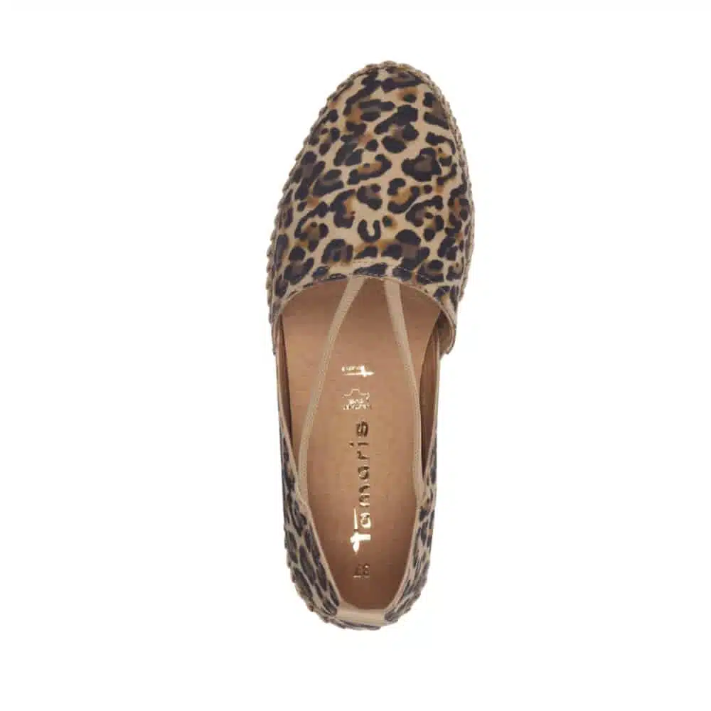 Tamaris ballerina til dame i printet leopard. Gå sommeren i møde med disse skønne Tamaris sko i leopardmønster og bast på sålen giver et dejligt sommerligt look. De er lavet af læder, hvilket giver en sofistikeret og holdbar finish. Med de elastiske bånd over vristen sidder skoen perfekt på foden, mens de udtagelige indlægssåler og Tamaris TouchIT teknologi sikrer fantastisk komfort hele dagen.