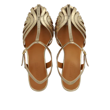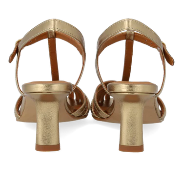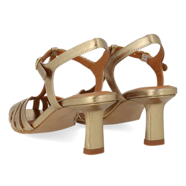 Sandalen har T-strap med justerbar spændelukning, vatteret indersål, læderfoer og en 6 cm hæl.