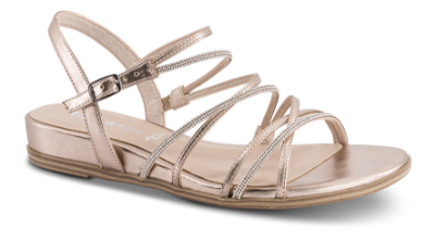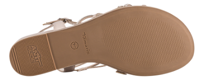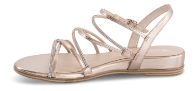 Elegante sandaler fra Tamaris med en lille kilehæl. Sandalen spænder langs hele foden, med sten og et metallic finish i en rose/bronze farve. De er perfekt til sommerens fester.