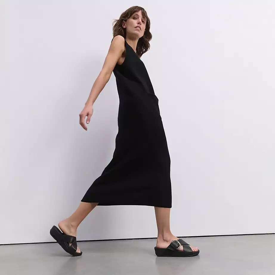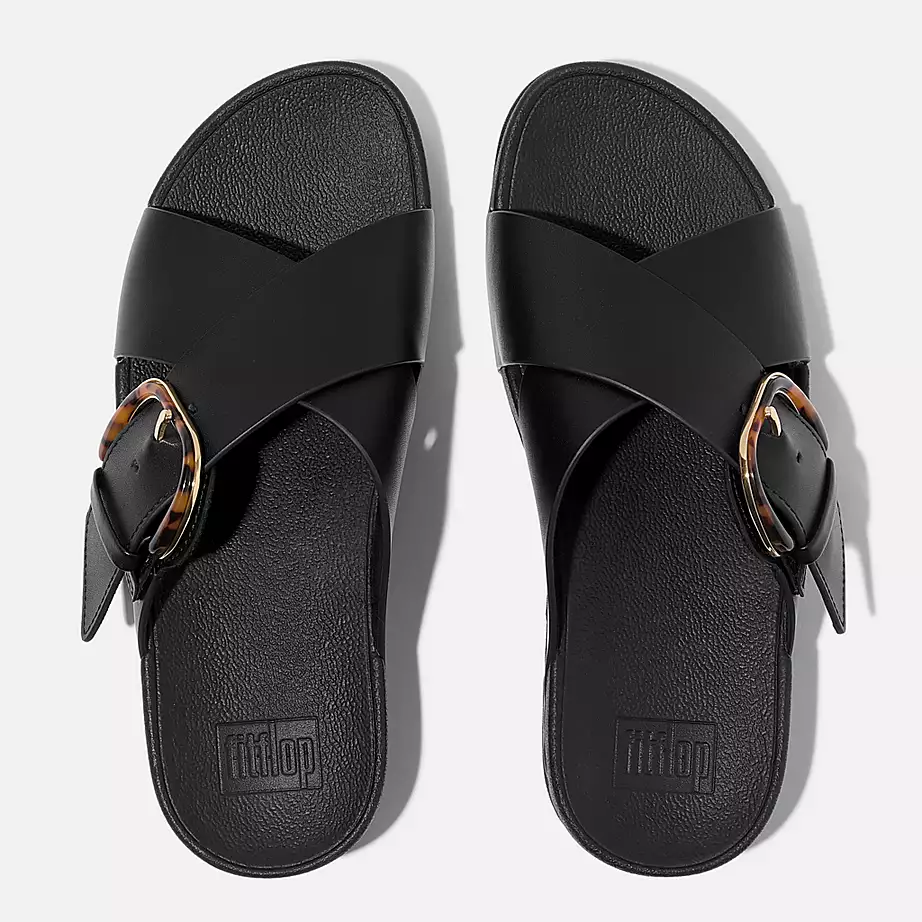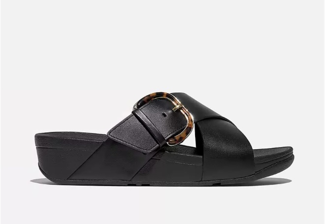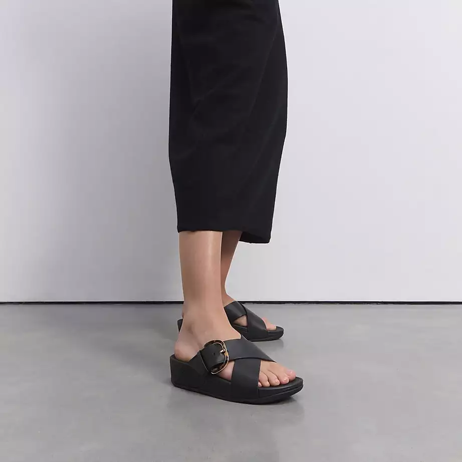 Sorte fitflop sandaler i sort, med et kryds henover foden og et spænde på siden. Sandalen har en lille kile, og en god comfort med massere stød absobering. Ydersålen er fremstillet i en flexibel gummi der gør dem skridsikre.