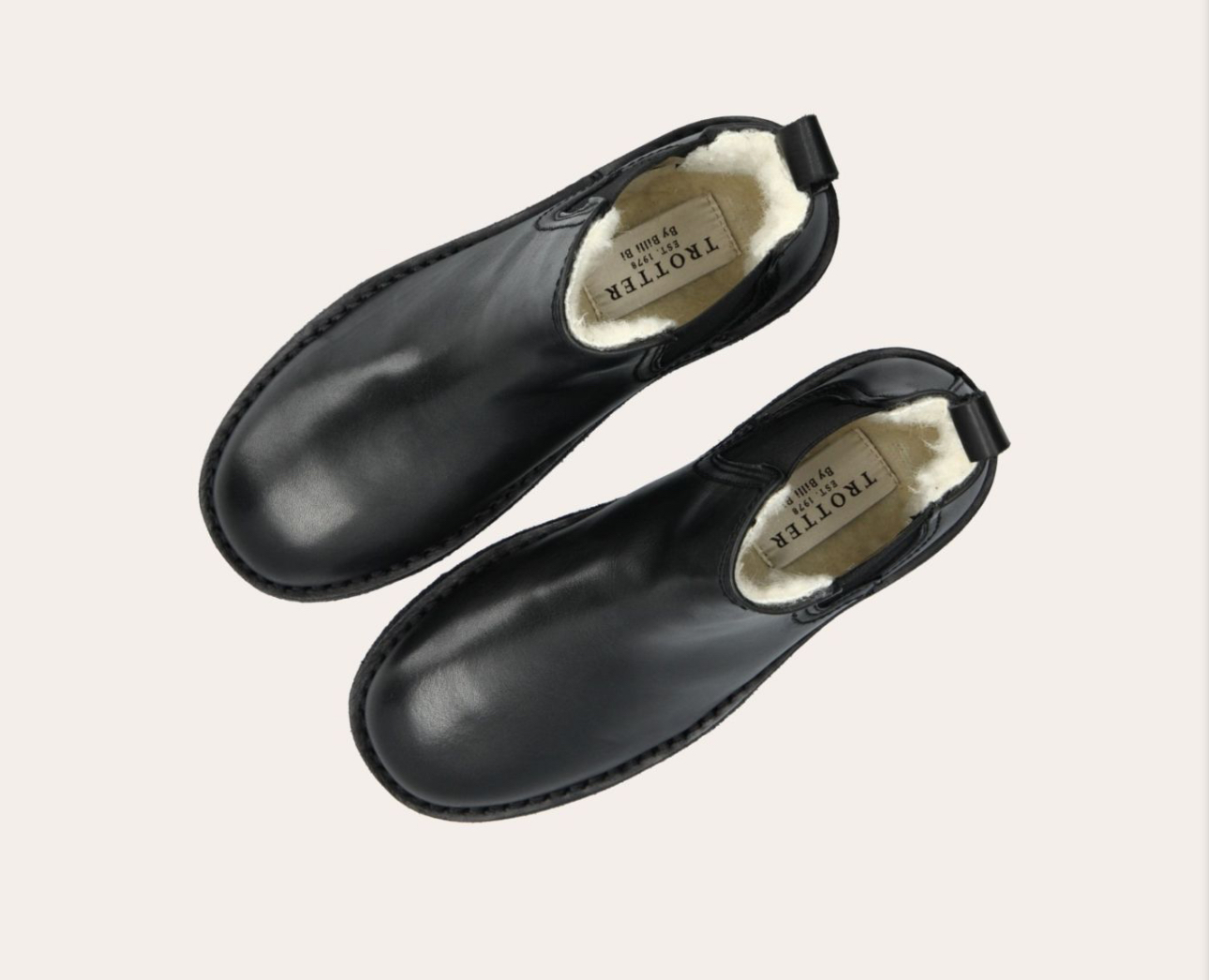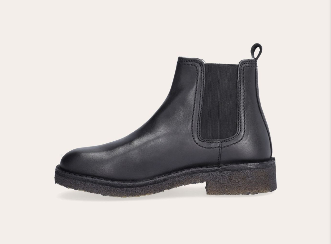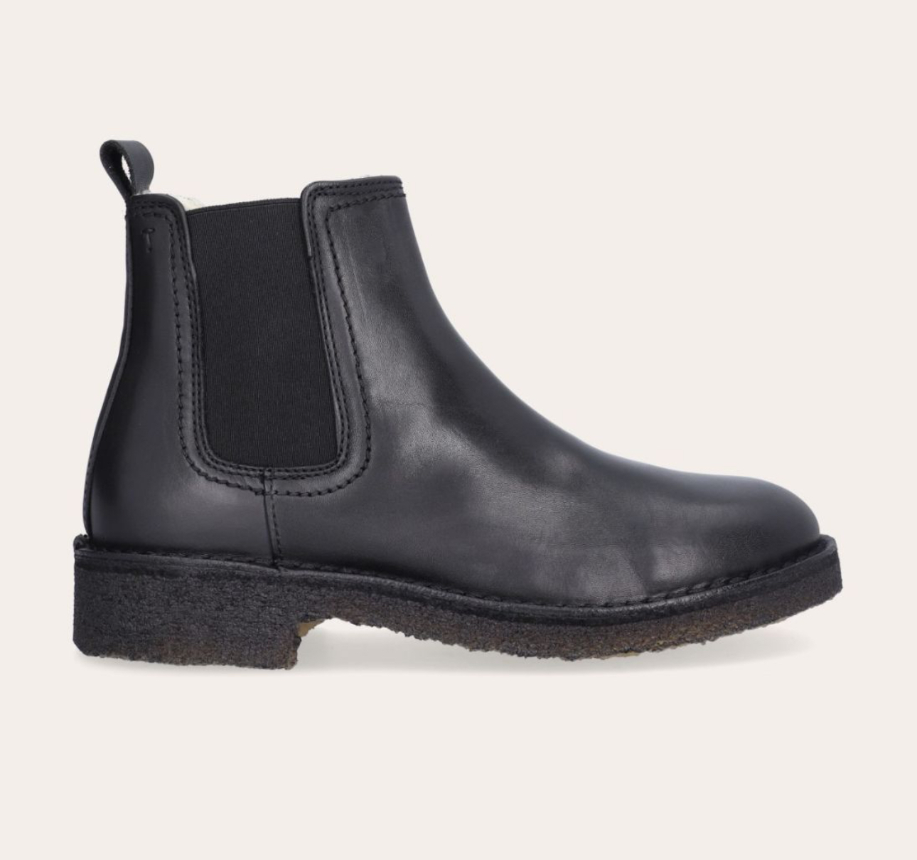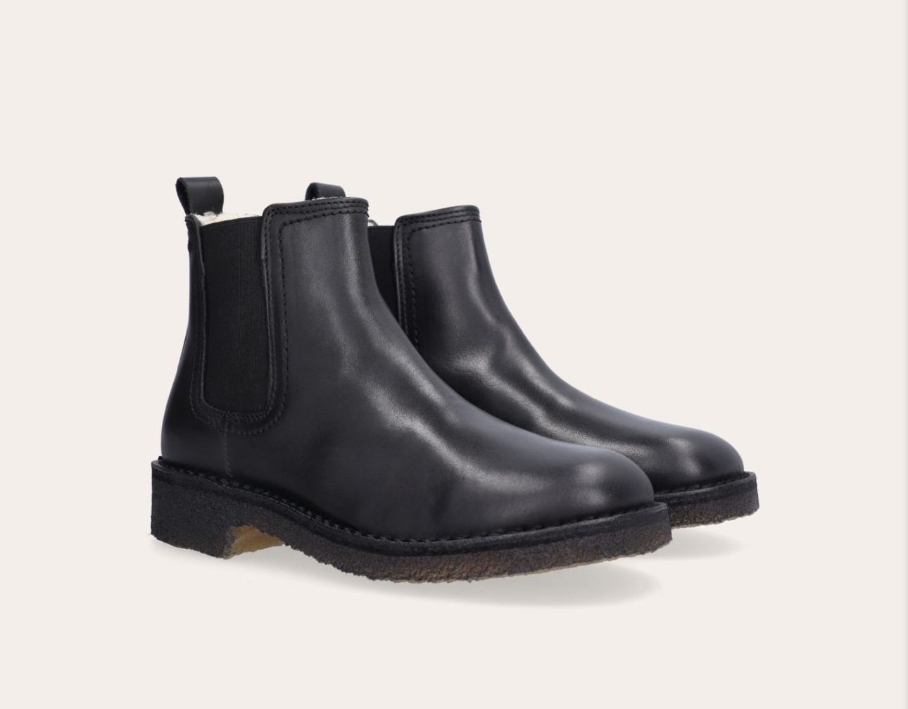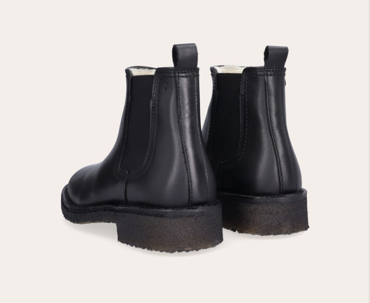 Håndlavet støvle, udført i sort glat skind med en rund tå. Støvler er dekoreret med en strop bagpå og elastik i begge sider - klassisk chelsea støvle. Derudover er støvlen foret med uld og har en blød rågummisål.
