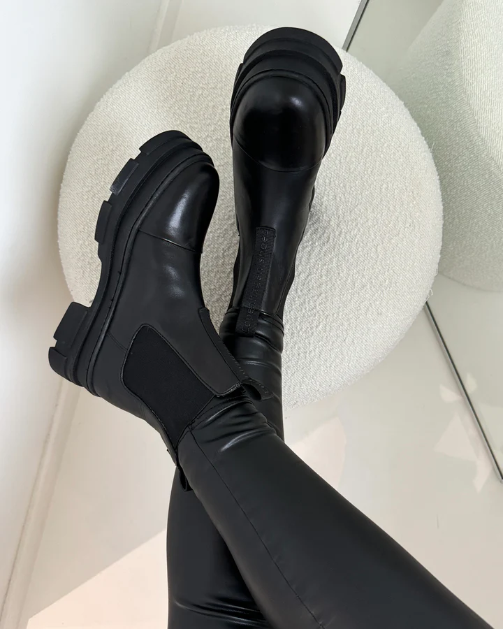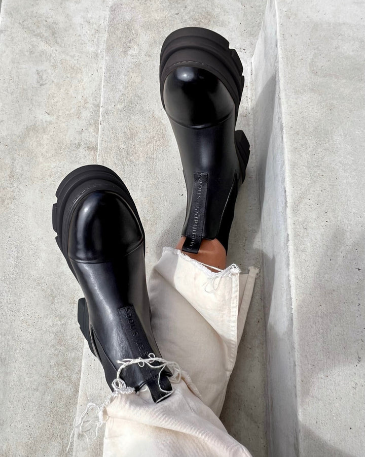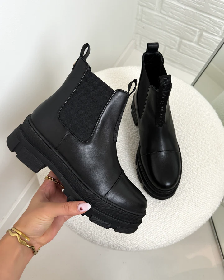 En cool og tidløs chelsea-støvle i skind med kraftige gummisåler og et råt, moderne udtryk.