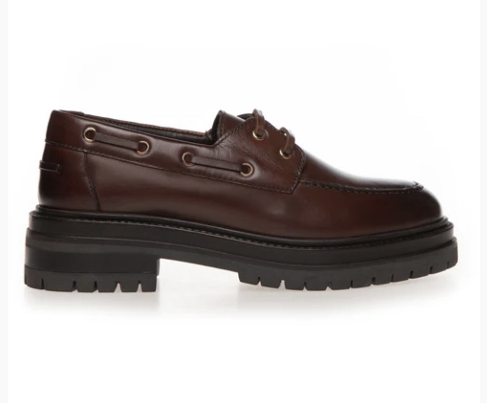 Eksklusiv sejlersko i glat brunt skind med moderne chunky sål og klassiske snøredetaljer med metaløjer hele vejen rundt.