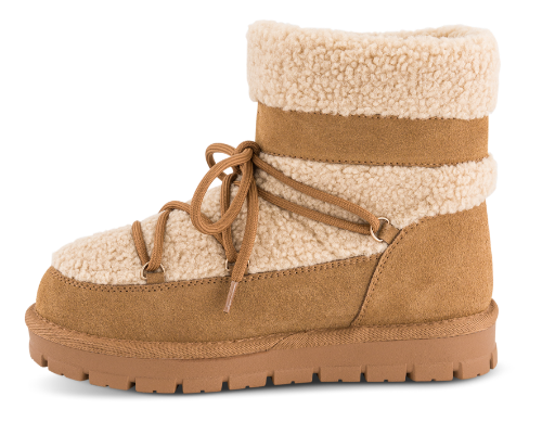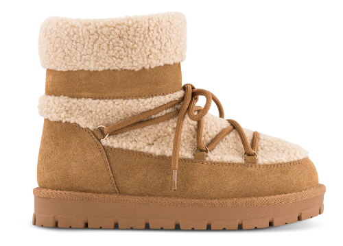 Den har et chunky design med hurtig snøre. Overdelen er udført ruskind med teddykant og indvendigt er den foret med varmt teddy, en blanding af 60% uld og 40% polyester, hvilket sikrer, at dine fødder forbliver varme og komfortable.