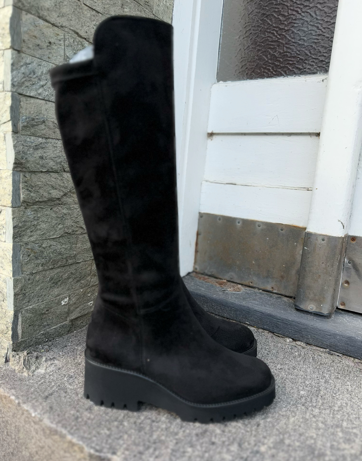 Sort langskaftet ruskindsstøvler fra Paul Green. Støvlerne har en lynlås i siden, så de er nemme at komme af og i.