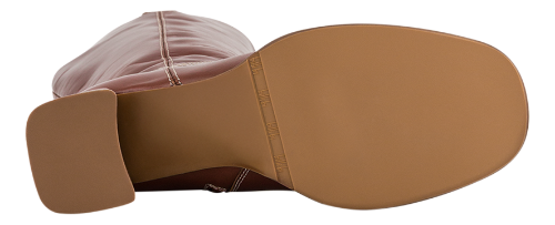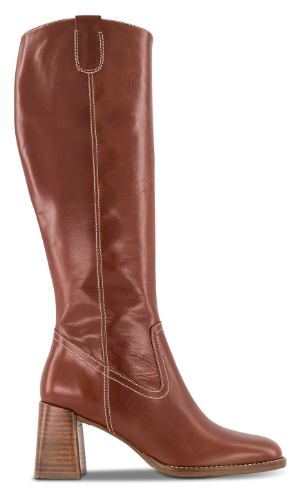 Håndlavet langskaftet støvle, udført i cognac glat skind med rund tå. Støvlen er dekoreret med synlige stikninger rundt om skaftet og foran. Støvlen har en lynlås på indersiden og et dekorativt indsnit på den anden side. Støvlen har en høj blokhæl. Støvlen har normal skaftevidde og sidder utrolig flot på mange.