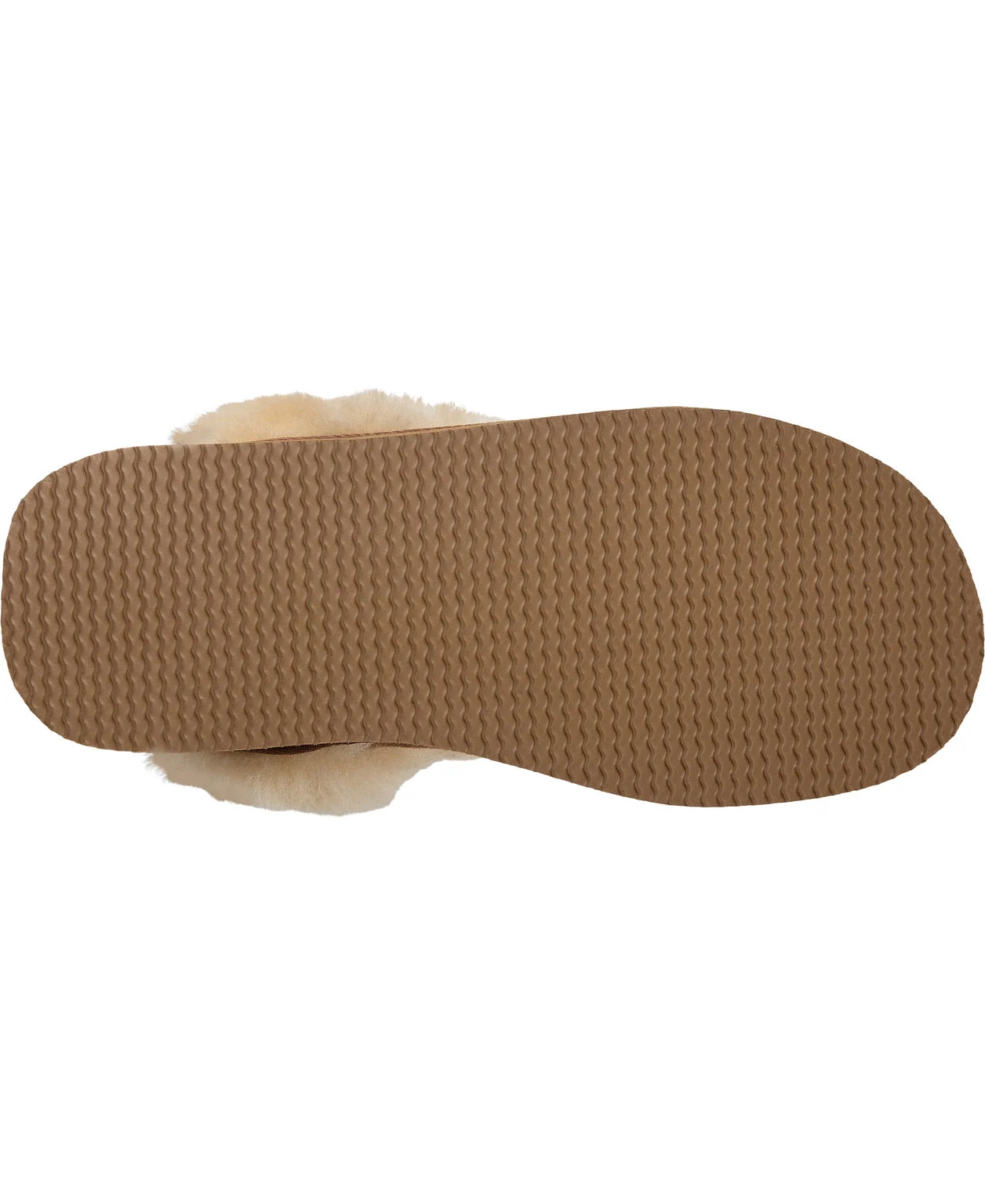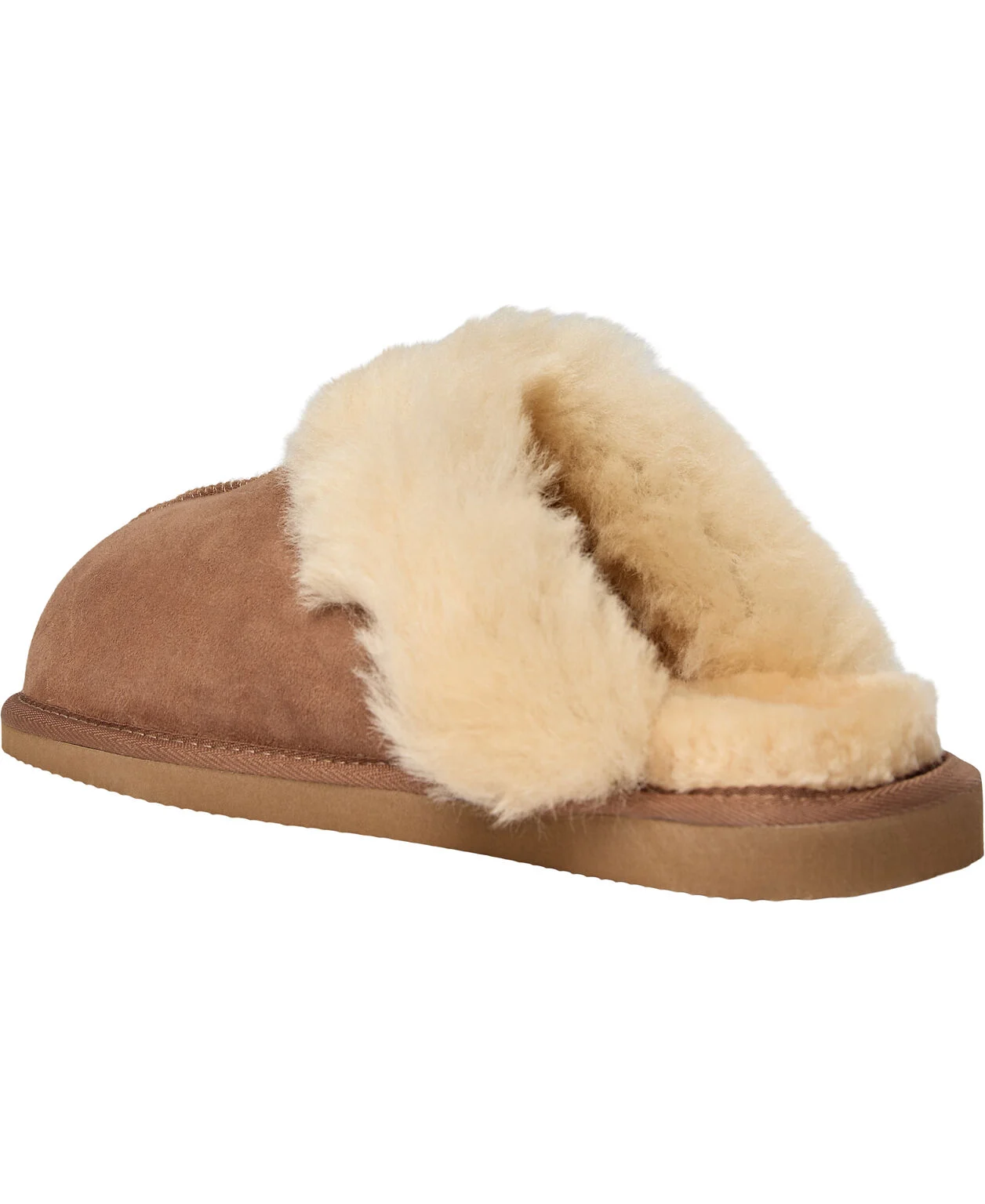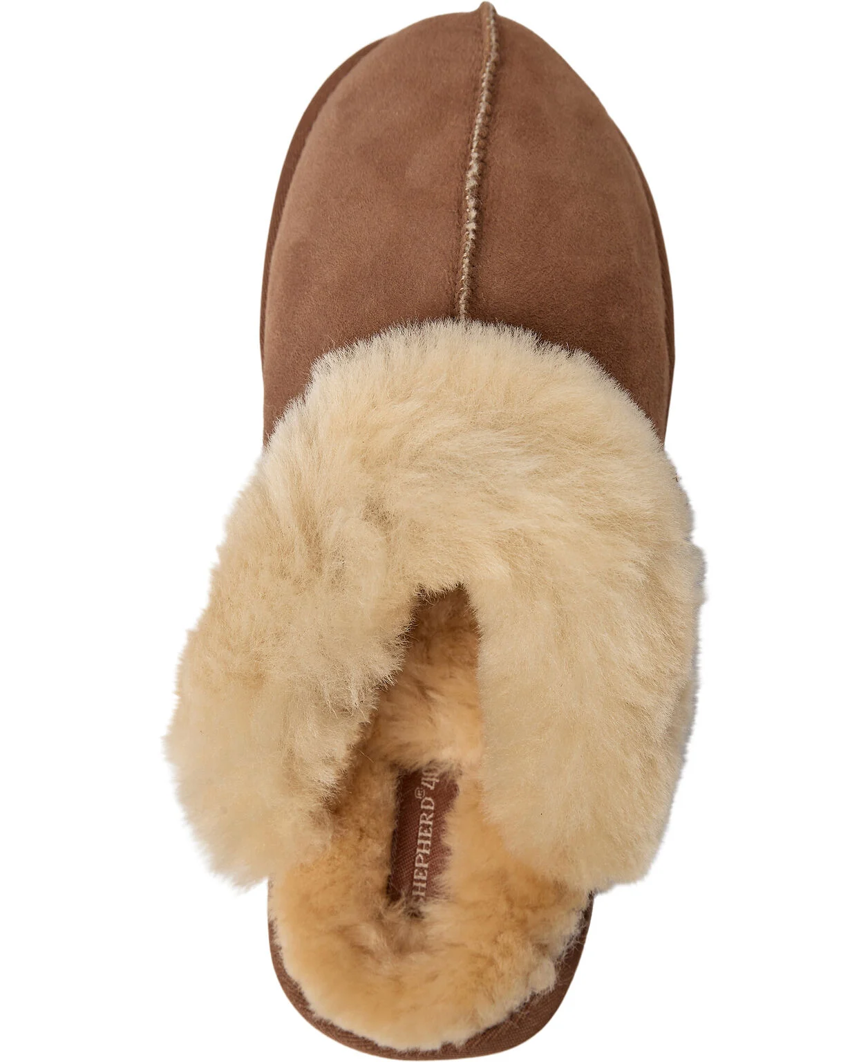 Hjemmeskoen har en bred lammeskinds krave og nogle dekorative stikninger på fronten og sålerne.