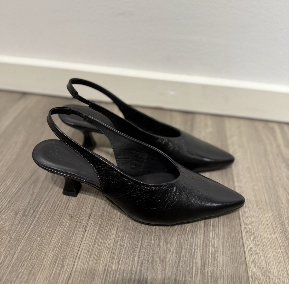 Smuk pump med spids snude og slingback. Skoen har polstret indersål for ekstra komfort og en let gummisål med 5 cm betrukket hæl. Udformet i naturligt og åndbart skind. Designet i Danmark og håndlavet i Portugal. Skindet er fantastisk blødt omkring foden, hvilket betyder, at der er høj komfort og god plads. Skoen findes i hele/halve str. Og er alm. i str.