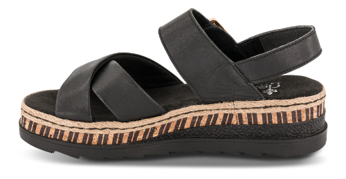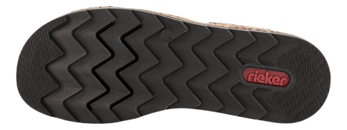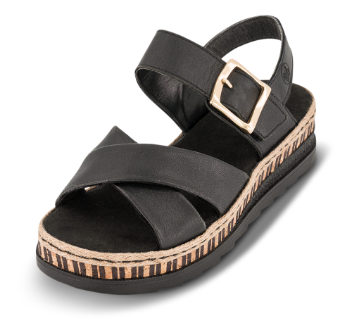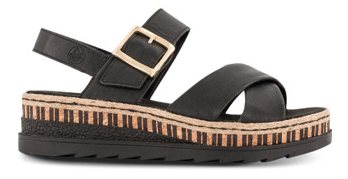 Denne stilfulde sandal fra Rieker er designet i en klassisk sort farve med en blød skindoverdel, der sikrer komfort og elegance.