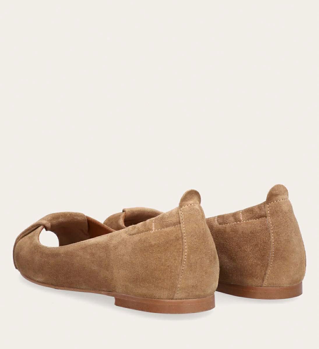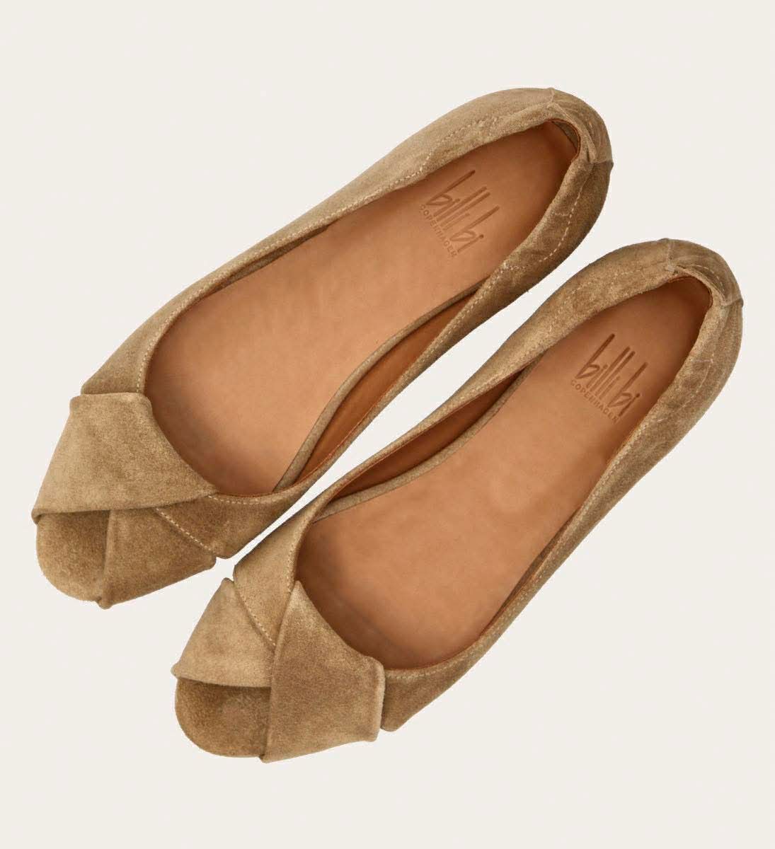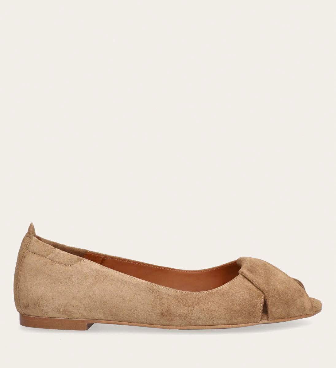 Håndlavet peep-toe ballerina, udført i lysebrunt ruskind med rund tå.