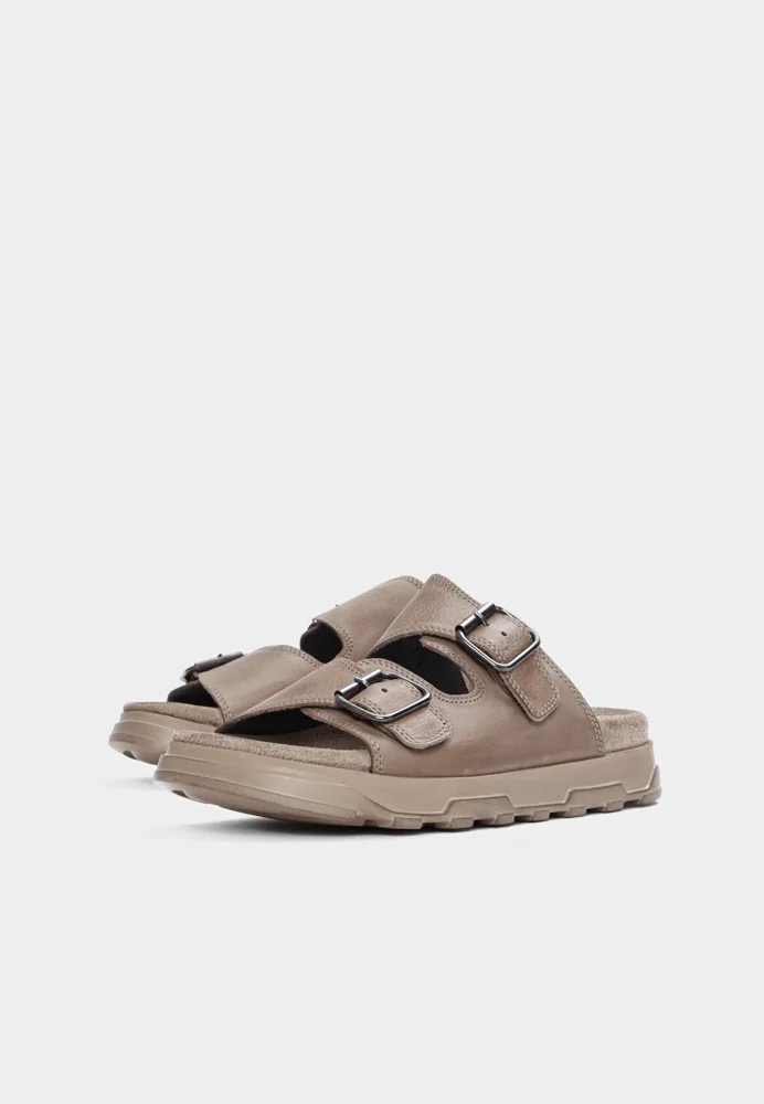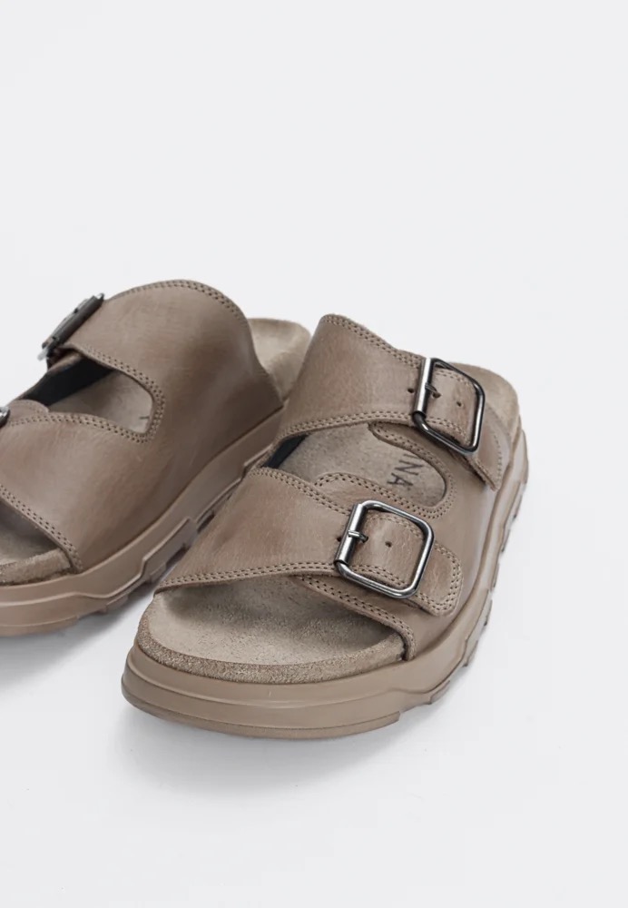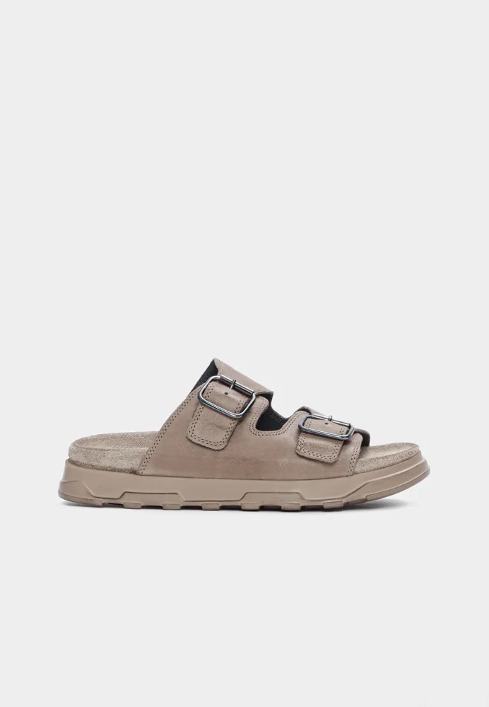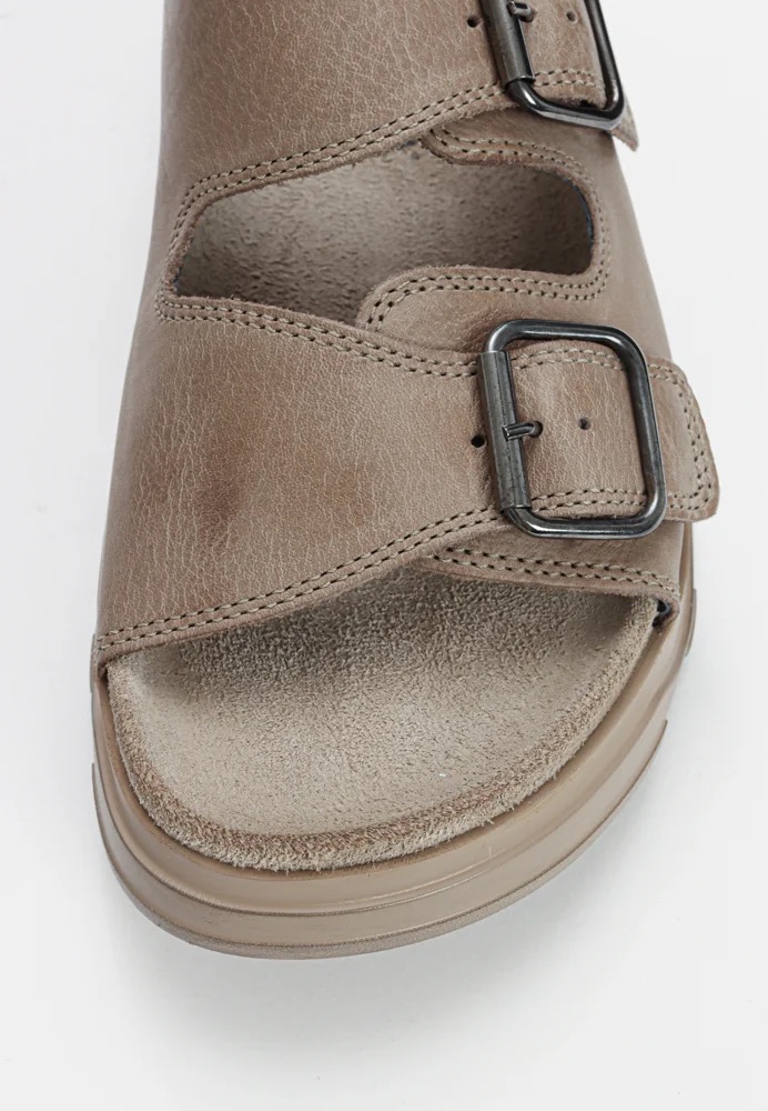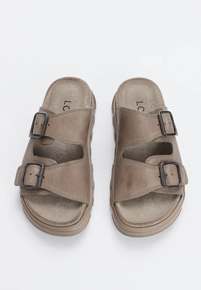 Lofina sandal i sandfarvet skind. Lækker og behagelig sandal i et cool look. Sandalen har to justerbare spænder.