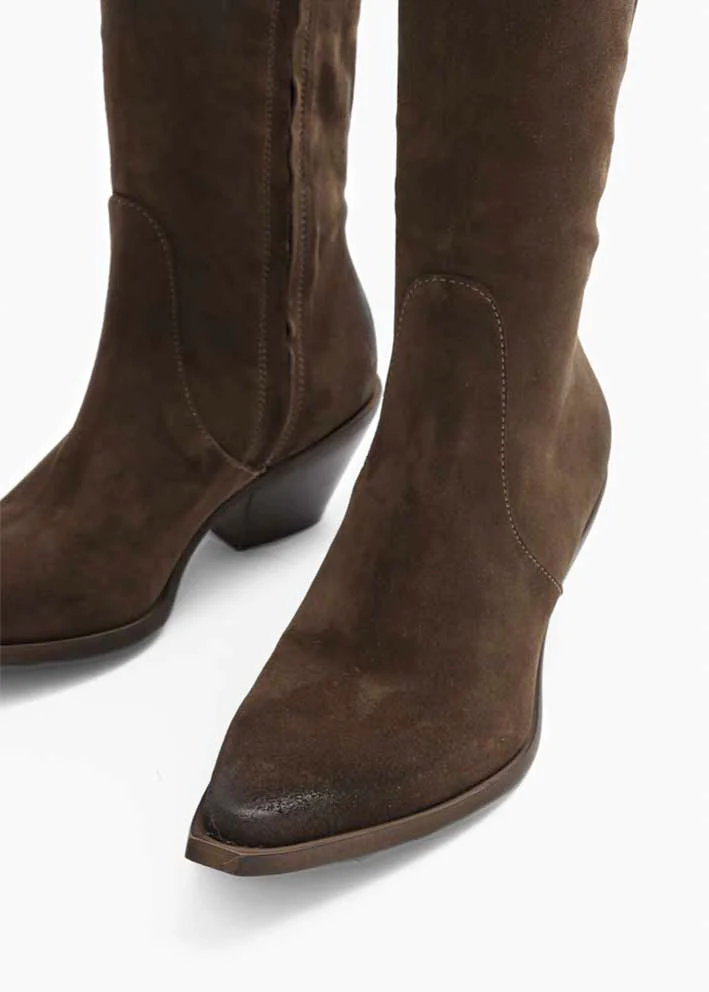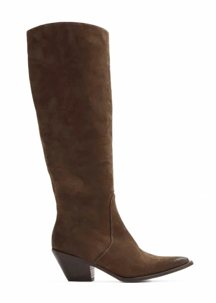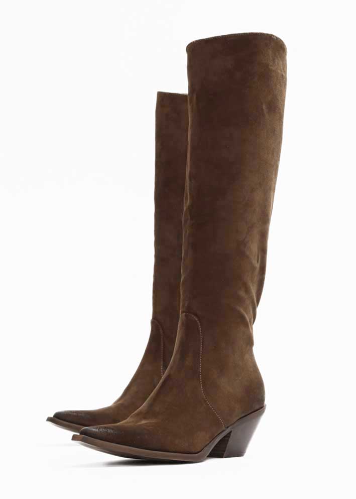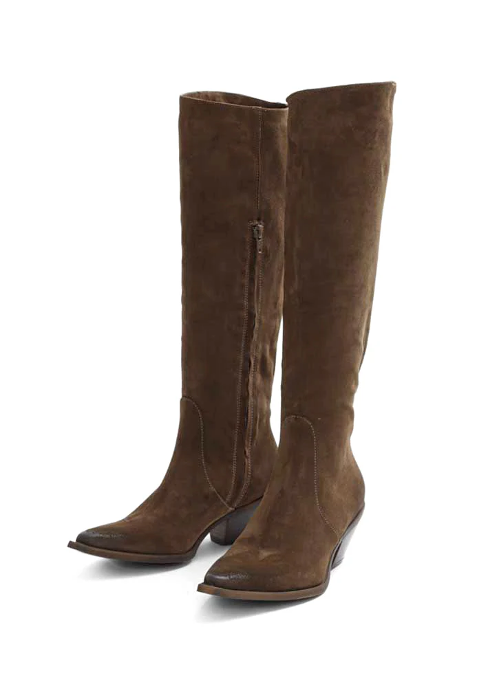 Umådeligt lækre langskaftede brune Josie støvler fra Bukela, designet i ruskind med brusheffekt på hæl og tå.