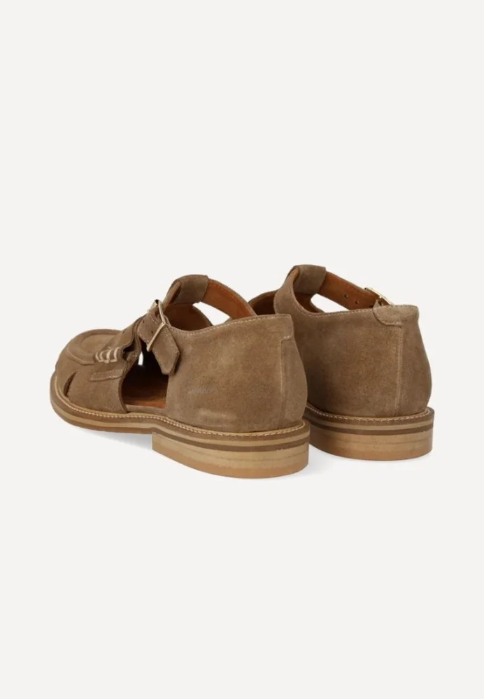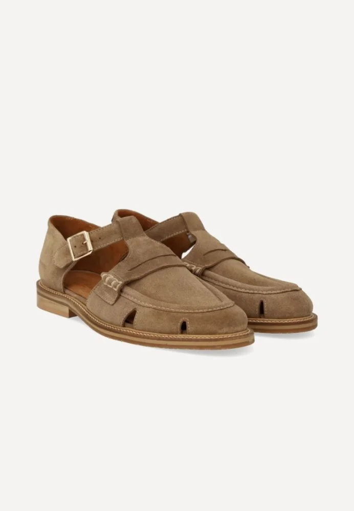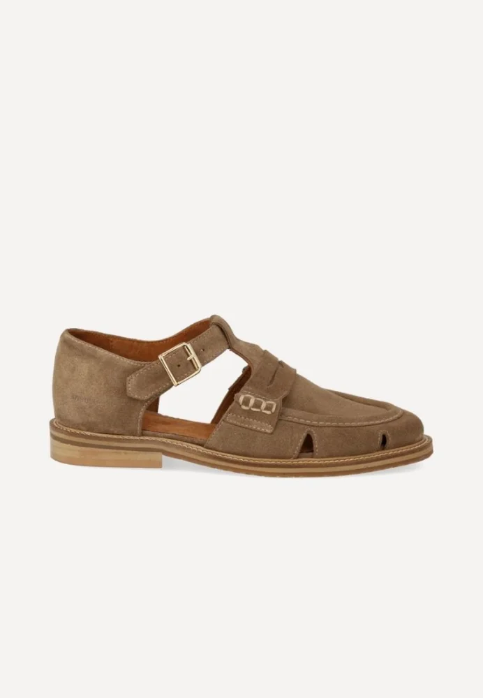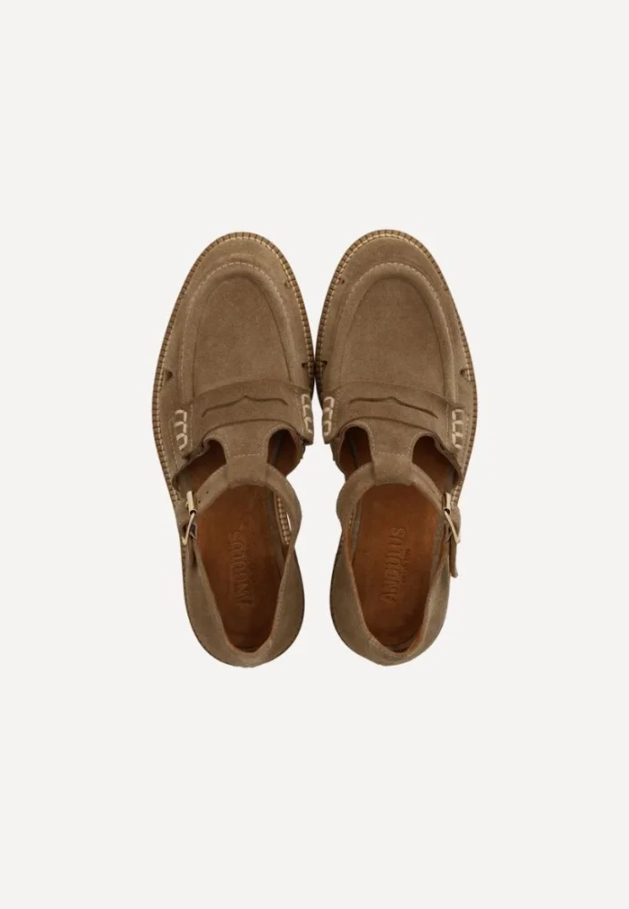 Skoen har en mandelformet snude, justerbar lukning med guldspænde, vatteret indersål og foer i kromfrit ruskind og en let, blød og fleksibel ANGULUS logo gummisål. Denne loafer er lavet i naturligt og åndbart skind.