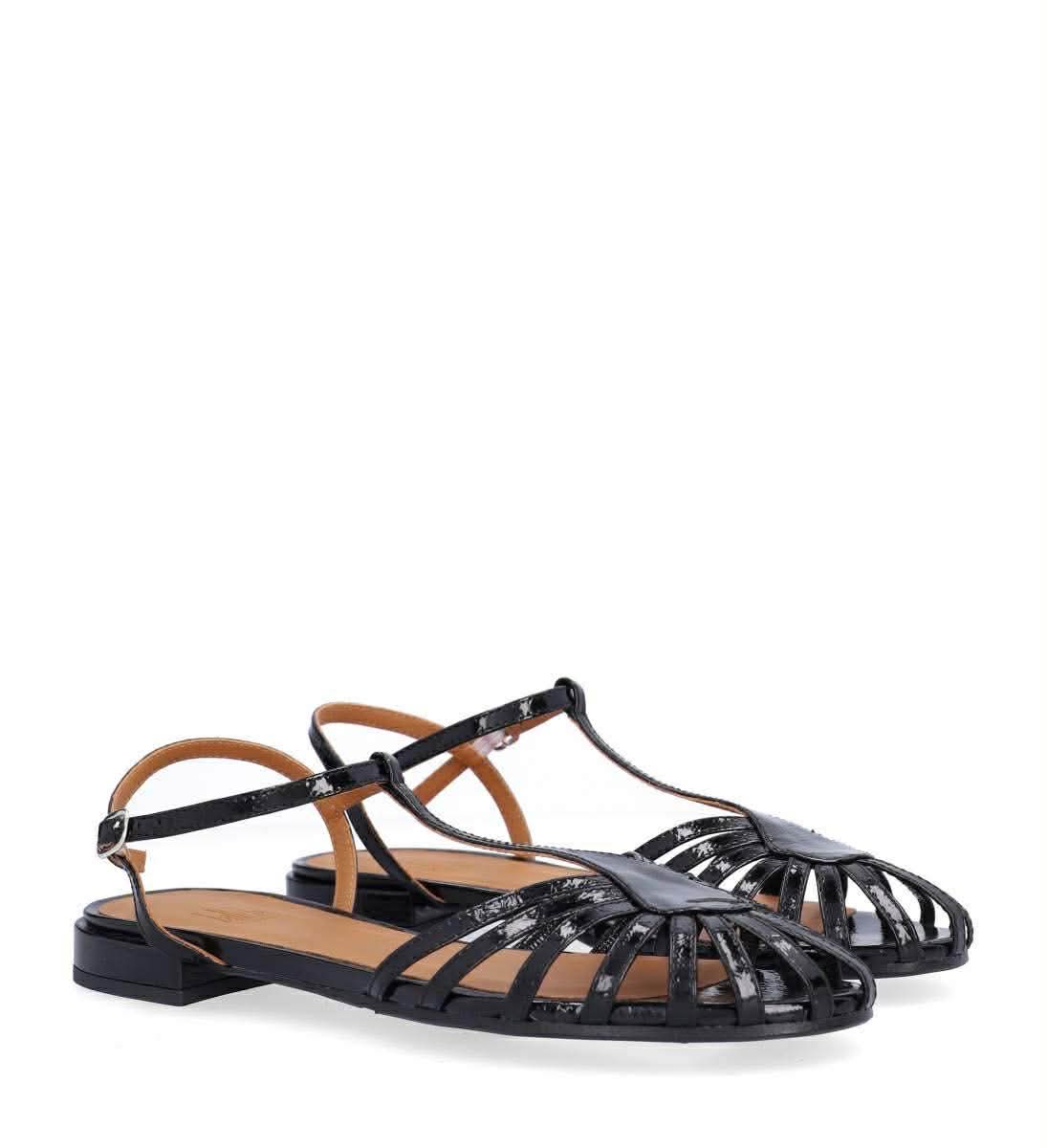 En håndlavet flad sandal, udført i mørkebrunt lakeret skind med afrundet åben tå fra Billi Bi.