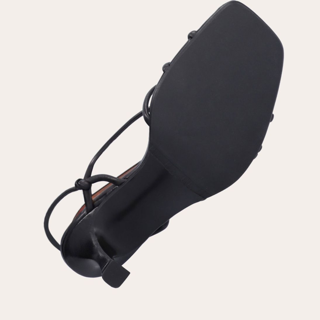 Sandalen har tynde remme der krydser forfoden med knude detalje og en justerbar ankelrem som lukkes med et guldfarvet spænde.