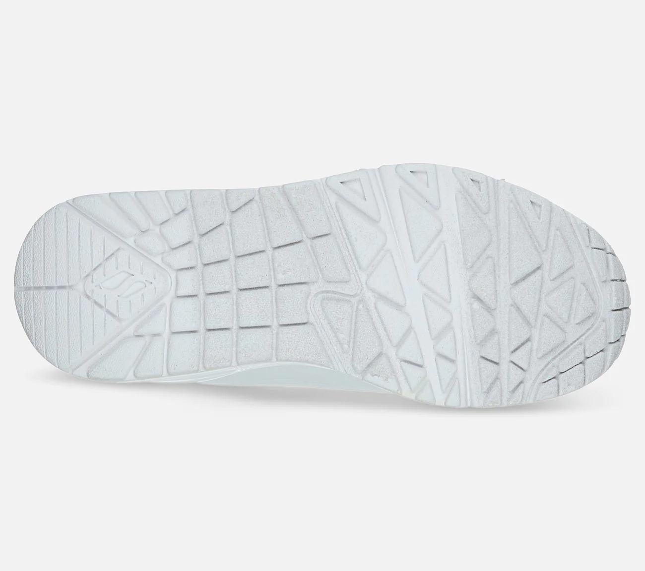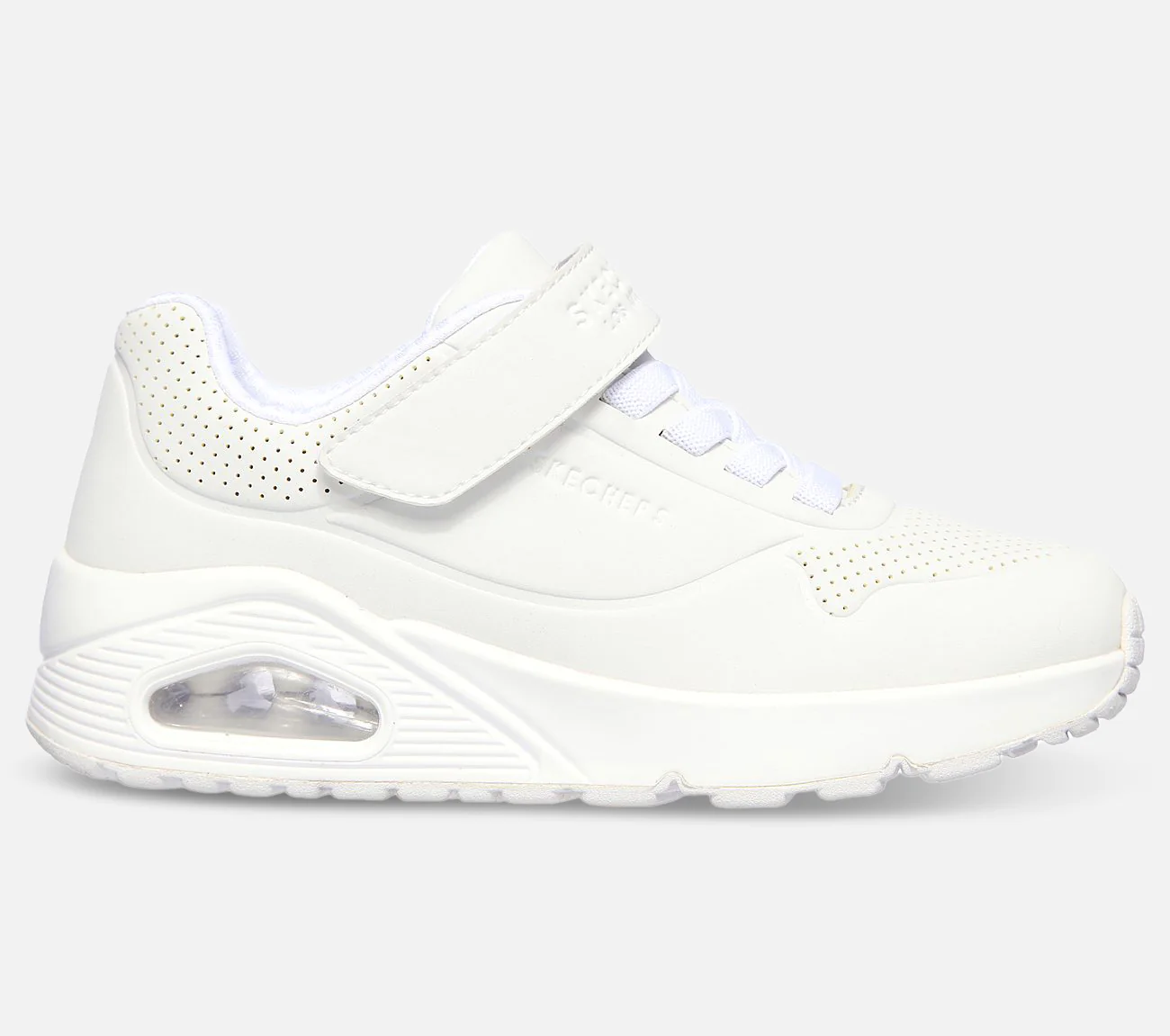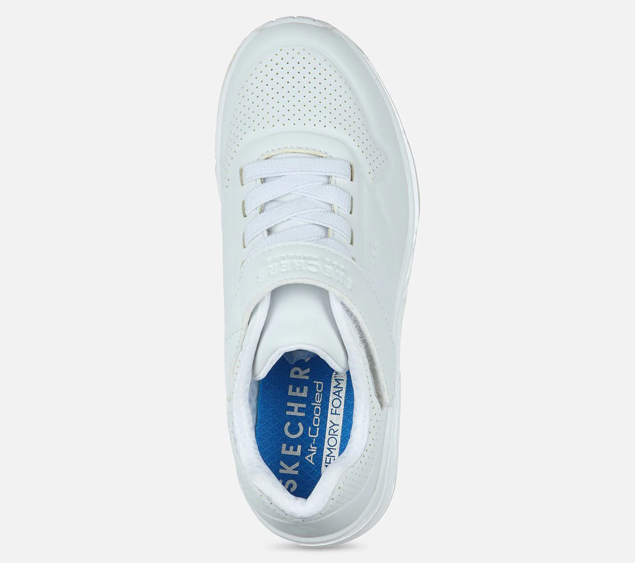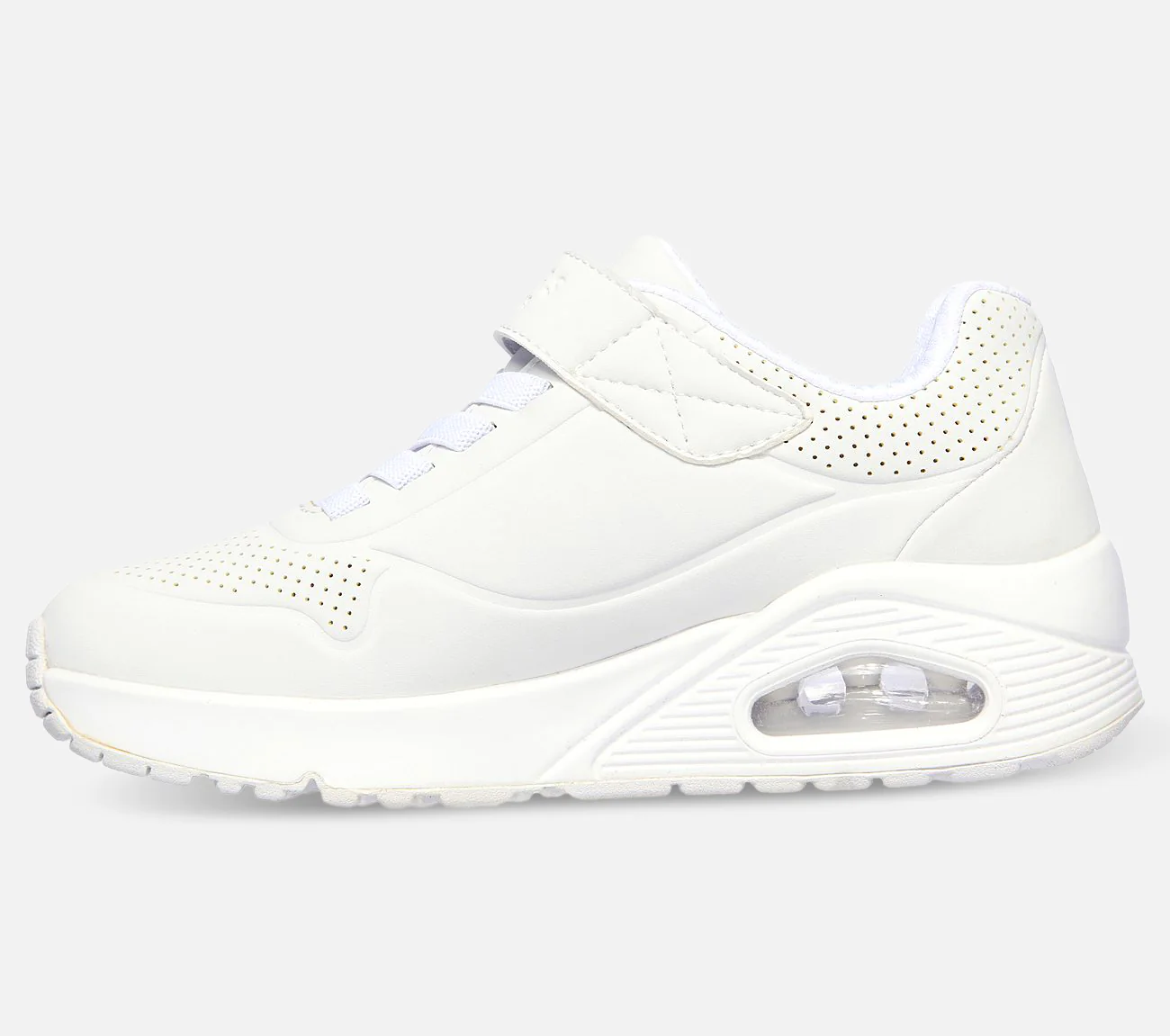 Hvide smarte sneakers fra Skechers. Elastik snøre og en velcrolukning, som sikre at skoen bliver siddende og at den er nem at komme i / af. God stødabsorbering i sålen.