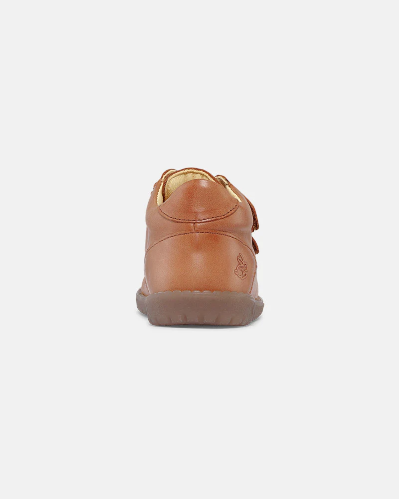 Søde Bundgaard begyndersko i lysebrun læder med en lille, indpræget kanin tæt ved hælen.